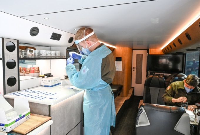 Zwei Fünferteams wechseln sich hier in 24-Stunden-Schichten ab. Schlafen können sie im Dienst im oberen Stock des Busses oder außer Dienst im Quartier in Iselsberg-Stronach. Im unteren Stock werden Personen, die ohne gültigen Nachweis zur Kontrolle kommen, getestet. Das übernehmen zwei Heeressanitäter, die von zwei weiteren Soldaten unterstützt werden. Ein Kommandant schaut ihnen dabei wortwörtlich auf die Finger. Ein zweiter Testbus steht bis zum Ende der Kontrollen in Matrei.