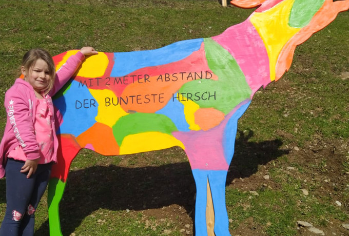 In der Corona-Pandemie sind kreative Lösungen gefragt. Um die Besucher des Asslinger Wildparks auf den 2-Meter-Abstand aufmerksam zu machen, haben Kindergartenkinder bunte Hirsche gebastelt. Die Hirsche wurden aus Holz ausgeschnitten und von den Kindern angemalt. Entlang des Rundweges sollen die Holztiere nun den kleinen und großen Besuchern des Wildparks auf spielerische Art zeigen, wieviel Abstand man zu anderen Besuchern halten soll.