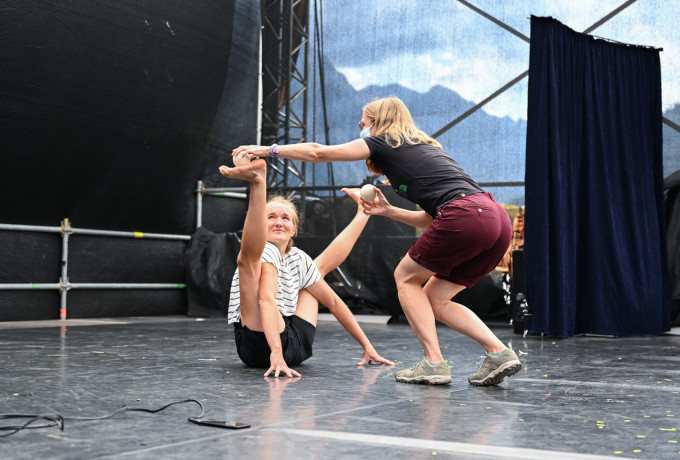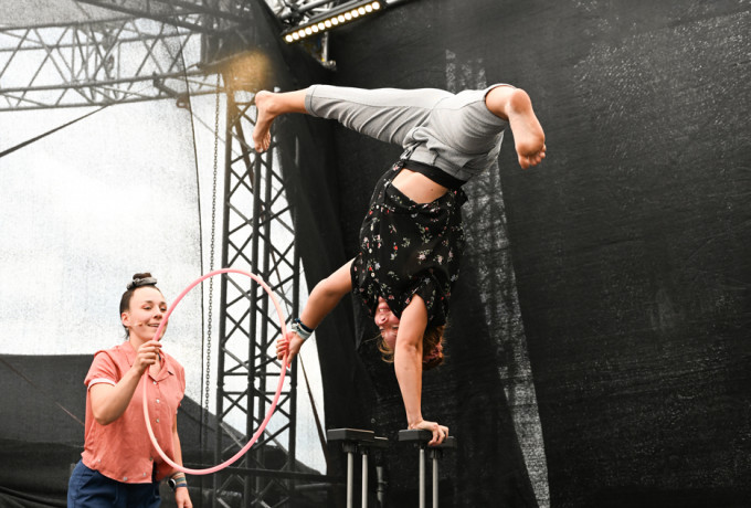 Für das „G“ von „geturnt“ zeigen sich die „Hop Scotch Circus Company“ sowie Roxana Küwen verantwortlich – die Künstlerinnen jonglierten mit Hula-Hoop-Reifen und Bällen, während sie auf abenteuerliche Weise im Handstand balancierten oder sich in so akrobatischer Weise verrenkten, dass jeder Yoga-Meister vor Neid erblassen könnte.