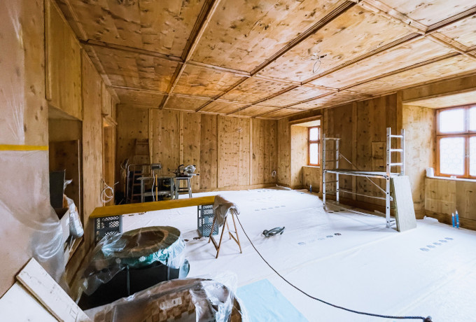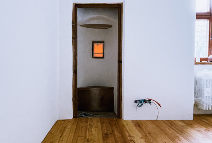 Die verputzten Räume erhielten einen Farbanstrich auf der traditionellen Basis von Sumpfkalk und strahlen jetzt in neuem altem Glanz. Der Holzboden im zukünftigen Büro des Amtsleiters, der aus dem 14. Jahrhundert stammt, wurde ausgebaut, sorgfältig gereinigt und Brett für Brett wieder eingesetzt. In den anderen Räumen werden neue Lärchenböden verlegt – gebürstet und geölt, wie es das Denkmalamt vorgegeben hat.