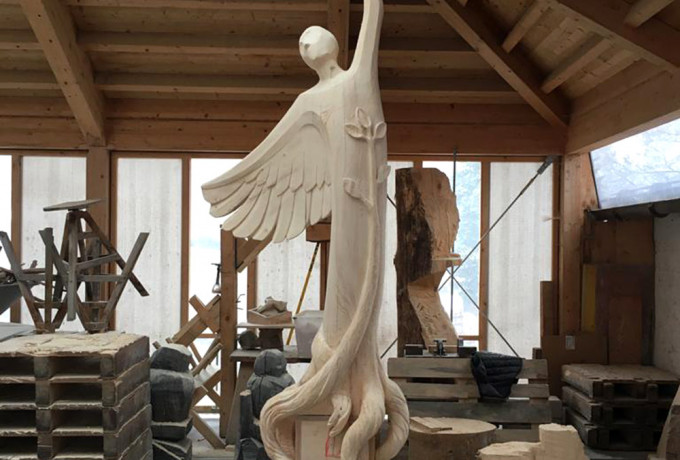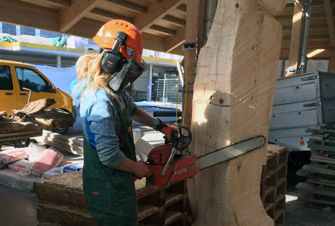 Die beiden begannen mit den Arbeiten am wuchtigen Rohling, einem vier Meter langen und 300 Kilo schweren Stamm einer Tanne mit 65 Zentimetern Durchmesser. Für das behutsame Herantasten an die finale Form brauchte es zuerst grobe Schnitte mit der Motorsäge, gefolgt von der Fein- und Detailarbeit mit dem Schnitzeisen sowie abschließender Oberflächenbehandlung mit diversen Schleifwerkzeugen. In rund 240 Arbeitsstunden haben Matthias und Raphaela aus dem Rohling die endgültige Figur geformt.