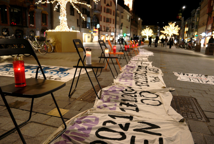 Eine Erklärung gleich vorweg: „Feminizid“ statt Femizid ist kein Schreibfehler, das betonen die Aktivistinnen des feministischen Aktionskollektivs in Innsbruck, während sie am 25. November in der Altstadt mit leeren Stühlen und brennenden Kerzen an 29 Frauen erinnern, die in Österreich allein in diesem Jahr männlicher Gewalt zum Opfer fielen. Zwei Frauen starben erst in den letzten Tagen in Tirol.