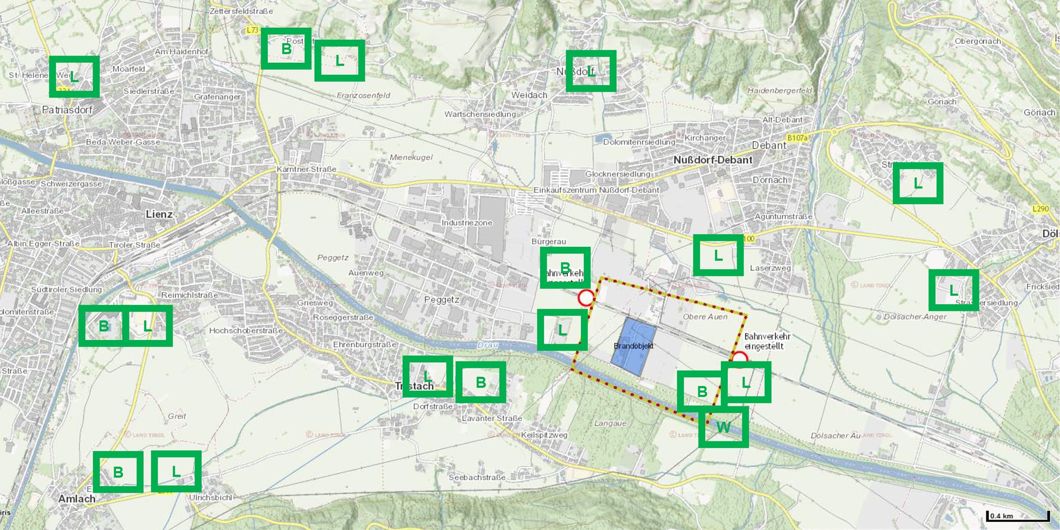 Die Analytische Taskforce München entnahm bereits Proben auf Anfahrt nach Osttirol, um auch allfällig weiträumigere Auswirkungen zu prüfen. Auch hier waren keine Grenzwert-Überschreitungen festzustellen. Die 18 Probenentnahmepunkte, die auch laut der SpezialistInnen der Taskforce das Gefahrenstellen-Spektrum abdeckten, können der Übersichtskarte entnommen werden. Hier die einzelnen Punkte der Probenentnahme. Legende: L Luft, B Boden, W Wasser