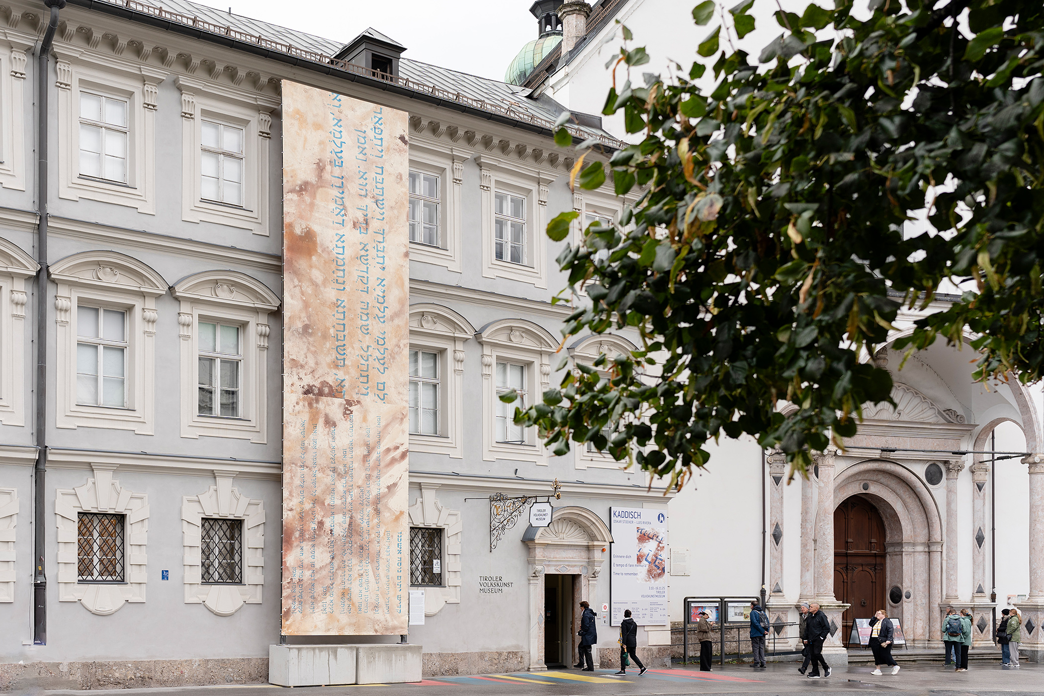 An der Fassade und im Kreuzgang des Tiroler Volkskunstmuseums wird vom 3. Oktober bis 16. November 2025 die Intervention „Kaddisch“ der Künstler Oskar Stocker und Luis Rivera gezeigt. Achtzig Jahre nach dem Ende des Zweiten Weltkriegs setzen sie damit ein sichtbares Zeichen für Erinnerungskultur und Frieden.