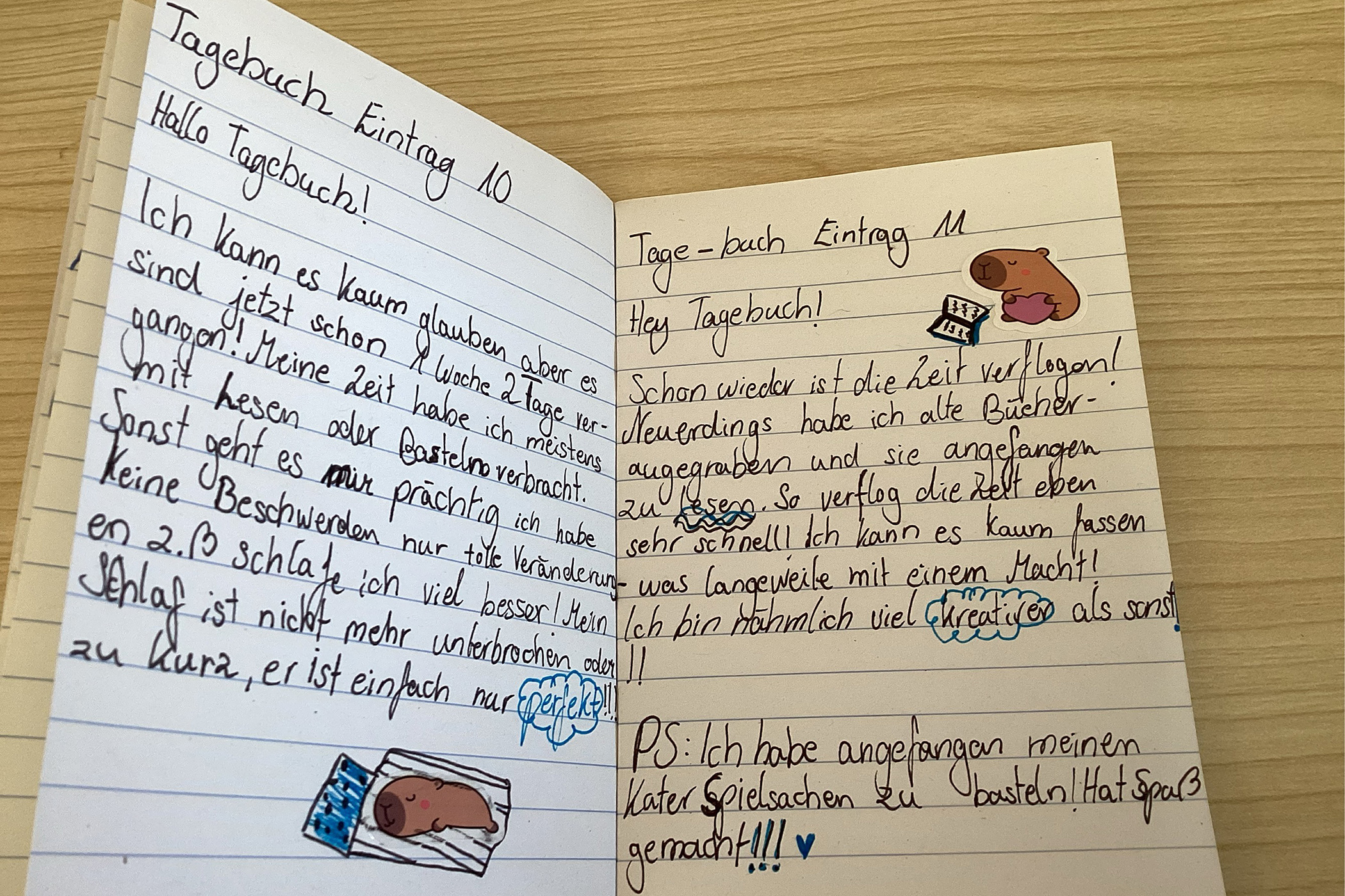 Noel und Isabell machen eine andere Erfahrung. Seit das Smartphone weg ist, hat sich ihr Leben verändert. Und zwar zum Besseren. Isabell schreibt: „Ich kann es kaum glauben, aber es sind jetzt schon eine Woche und zwei Tage vergangen. Meine Zeit habe ich meistens mit Lesen oder Basteln verbracht. Sonst geht es mir prächtig. Ich habe keine Beschwerden, nur tolle Veränderungen, z.B. schlafe ich viel besser! Mein Schlaf ist nicht mehr unterbrochen oder zu kurz, er ist einfach perfekt!“