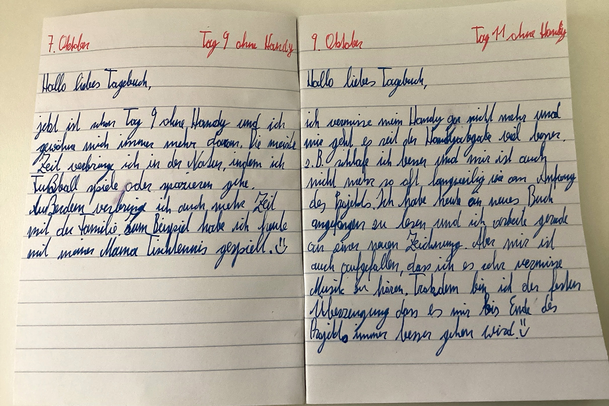 Die Einträge, die wir heute vorstellen, wurden zwischen 6. und 9. Oktober verfasst, also schon eine gute Woche nachdem die Jugendlichen ihre Handys in einer versperrten Box in der Schule deponiert hatten. Tatsächlich sind die Reaktionen unterschiedlich und teilweise sehr bemerkenswert. Alena kämpft. Sie vermisst ihr Handy wirklich, gibt aber dennoch nicht auf. Das wäre ihr peinlich. „Symptome habe ich immer noch keine“, schreibt sie.