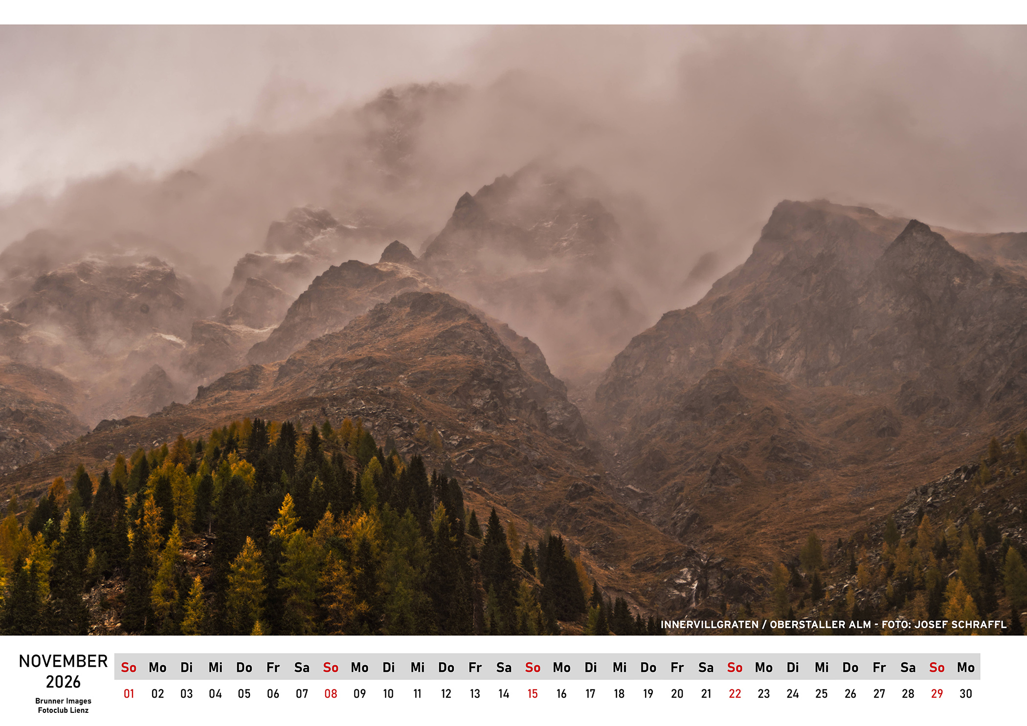 „Osttirol - Der Augenblick im Fokus“ ist Titel dieser Kalender-Edition, deren Reinerlös von 15 Euro pro Stück der „Trauerwerkstatt Osttirol" zugute kommt. Diese Einrichtung begleitet Menschen in schweren Verlust- und Krisenzeiten. Der Kalender 2026 kann ab sofort vorbestellt werden - und wird noch 2025 ausgeliefert. Bestellen kann man das attraktive Kalendarium unter dem Weblink: kalender.brunner-images.at. Hier zwei ausgewählte Beispiele, die Kalenderseiten September und November: