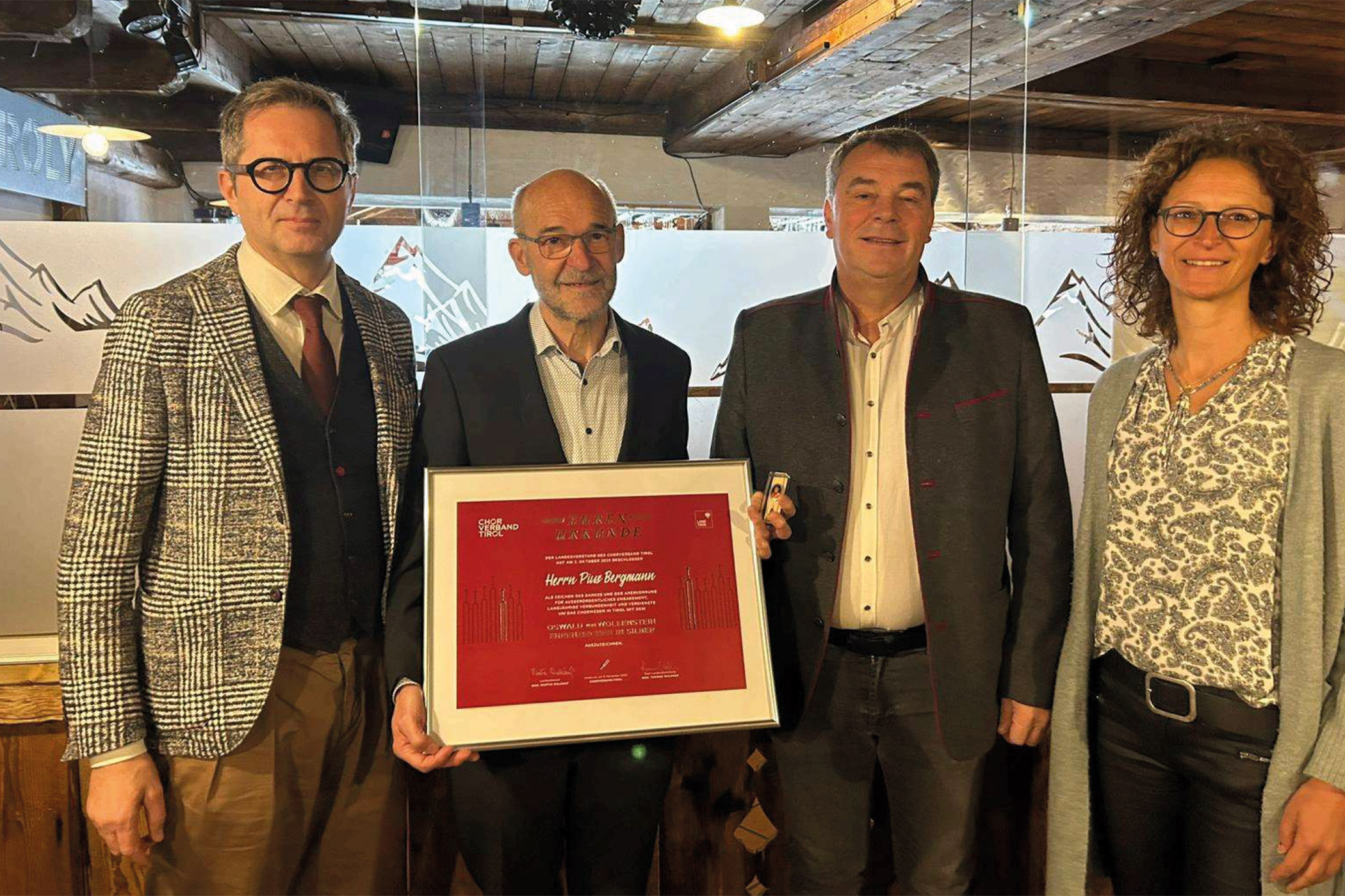 Er führt ein Leben für die Musik! Pius Bergmann, Chorleiter der Kirchenchores Debant, wurde kürzlich im Rahmen der Jahreshauptversammlung mit dem „Oswald von Wolkenstein Ehrenzeichen“ geehrt. Die Auszeichnung, verliehen vom Tiroler Chorverband, steht für seine jahrzehntelangen Verdienste um das Chorwesen. Neben seinem musikalischen Engagement würdigt das Ehrenzeichen auch seine Leidenschaft und Hingabe für die Musik, die Bergmann von klein auf begleitete. Schon in der Volksschulzeit war er Mitglied des Kinderchores der Hl. Familie. Gemeinsam mit seinen Geschwistern musizierte er auch zu Hause. Sein Vater erkannte das Talent und förderte seine Kinder, die bald schon bei Weihnachtsfeiern im Krankenhaus Lienz oder bei Messen in St. Andrä auftraten.