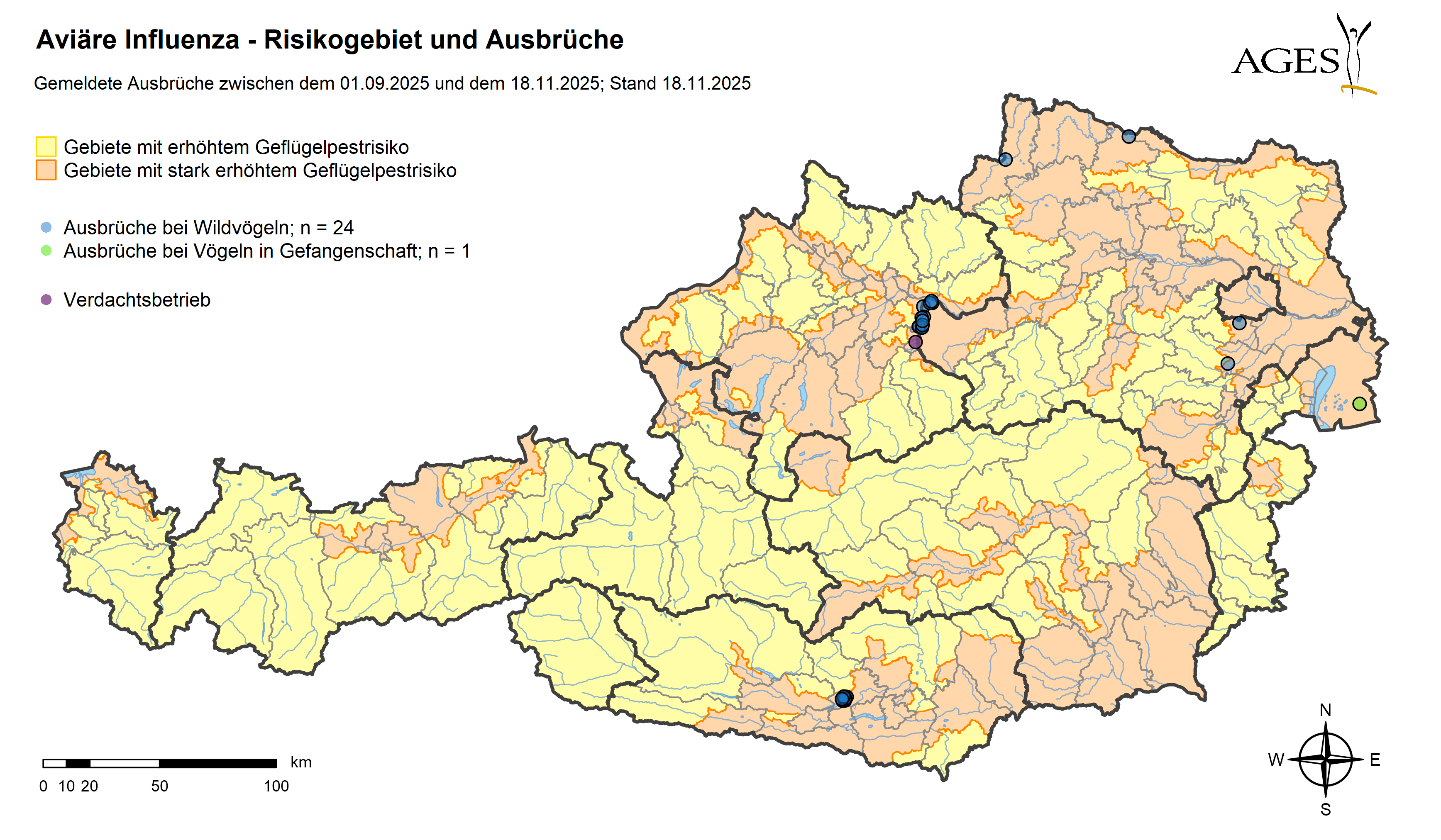 Die Vogelgrippe ist bislang in Tirol bei Haus- oder Wildvögeln noch nicht nachgewiesen worden. Das Virus gelte laut Landesveterinärdirektor Matthias Vill weiterhin als nicht gefährlich für Menschen – eine Übertragung sei nur in seltenen Fällen bei engem Geflügelkontakt möglich. Trotzdem bleibe das Risiko einer Ausbreitung insbesondere durch Wildvögel hoch, vor allem in Gewässernähe.
