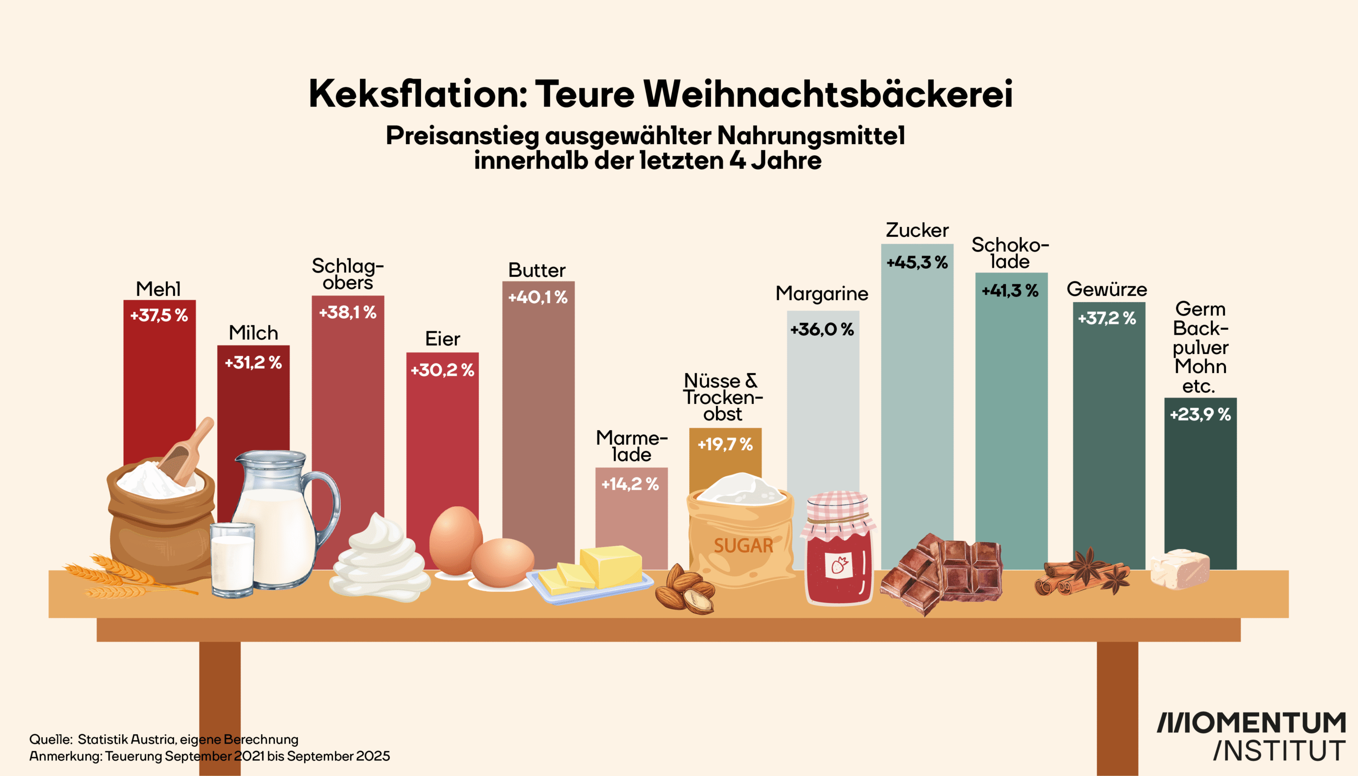In knapp einem Monat ist Weihnachten – die Zeit der traditionell selbst gebackenen Weihnachtskekse beginnt. Doch wer heuer Zutaten für Vanillekipferl, Lebkuchen & Co. kauft, muss deutlich tiefer in die Tasche greifen. Eine aktuelle Analyse des Momentum Instituts zeigt: Die Preise für typische Kekszutaten sind um ein Drittel teurer als noch vor vier Jahren und stiegen sogar stärker als die allgemeine Inflation oder jene für Nahrungsmittel gesamt.