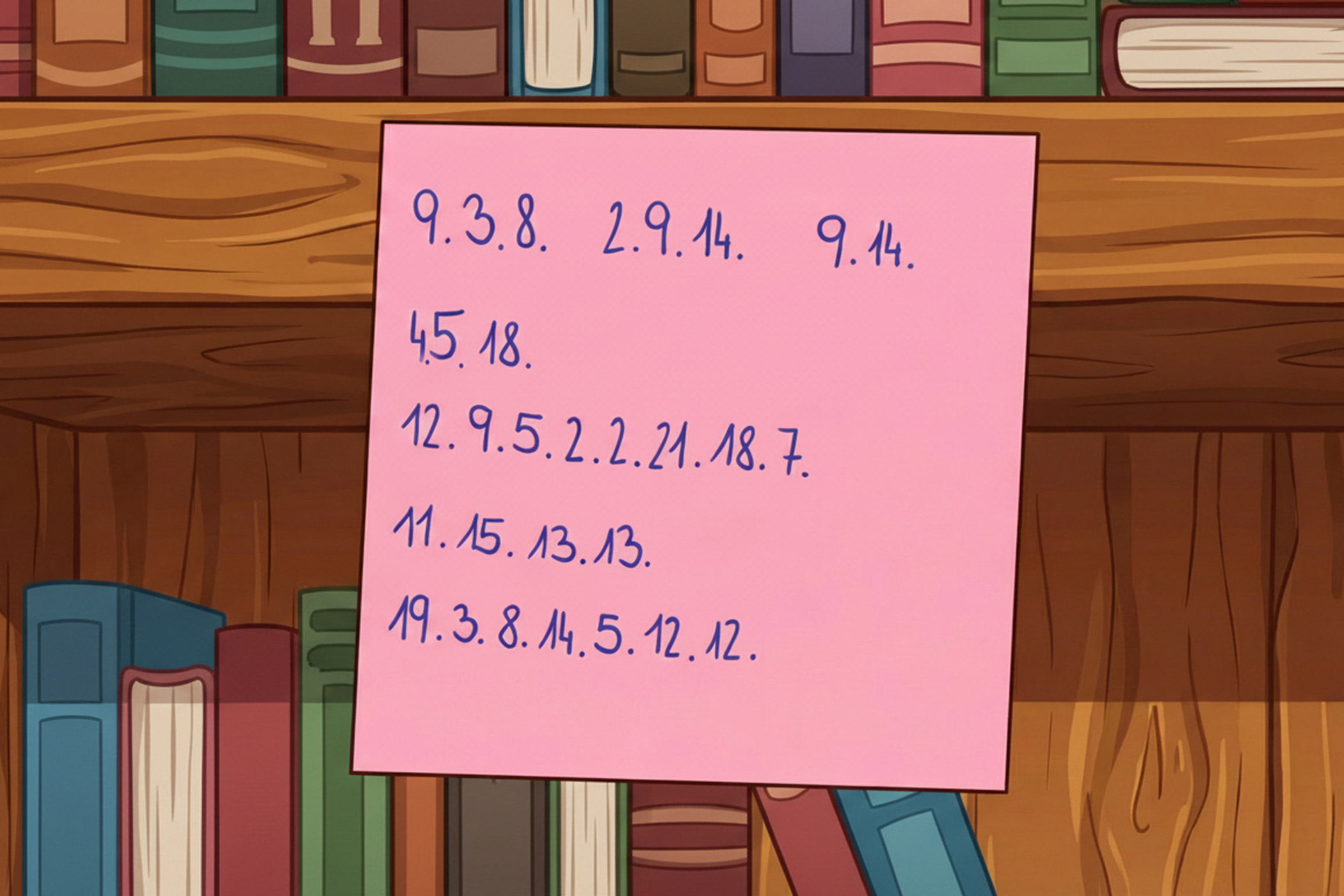 Das Post-it wirkt nicht wie eine gewöhnliche Erinnerungsnotiz – es scheint bewusst dort platziert worden zu sein. Die Zahlen darauf erinnern Lena sofort an einen geheimen Code. Es steht: „9.3.8. 2.9.14. 9.14. 4.5.18. 12.9.5.2.2.21.18.7. 11.15.13.13. 19.3.8.14.5.12.12.“