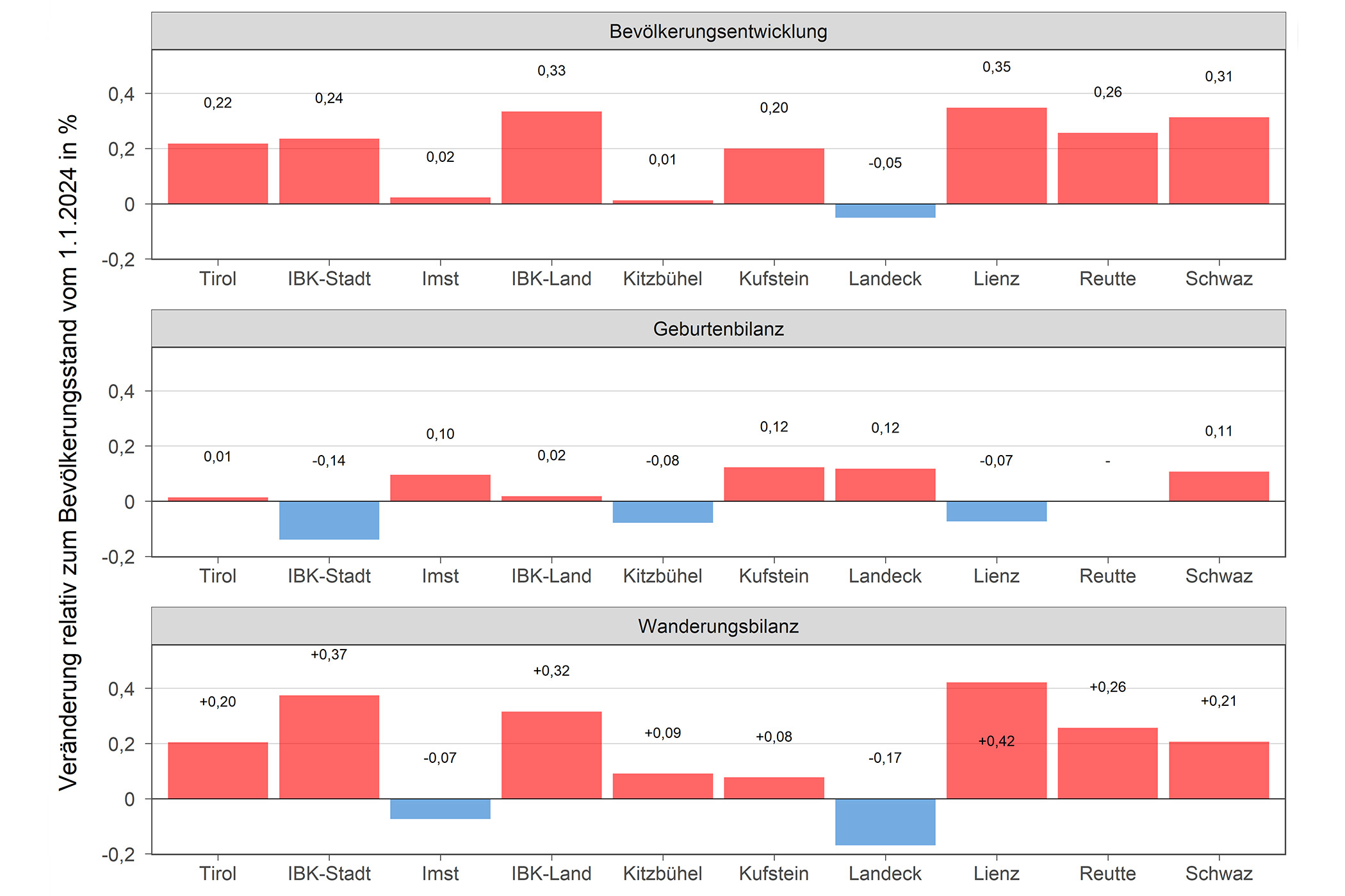 Der Bezirk Lienz sticht aus den Daten für das Jahr 2024 insofern heraus, als er das größte Bevölkerungswachstum aller Tiroler Bezirke aufweist. Obwohl die Geburtenbilanz negativ war, also mehr Menschen starben als lebend geboren wurden, führte die vergleichsweise hohe errechnete Wanderungsbilanz zu einem Bevölkerungswachstum. Insgesamt lebten am 1.1.2025 somit 49.011 Personen im Bezirk Lienz, was einer Zunahme von 170 Osttiroler:innen im Vergleich zum Stichtag 2024 entspricht.