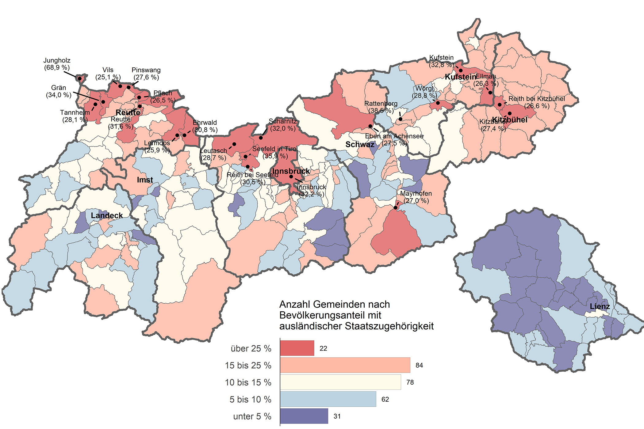 Betrachtet man die Bevölkerungszahlen unter dem Gesichtspunkt der ausländischen Herkunft, ist Lienz im Tirolvergleich mit 8,9 Prozent Schlusslicht. Die größte Gruppe der Wohnbevölkerung mit einer ausländischen Staatsangehörigkeit stellen die Deutschen mit zwei Prozent dar, gefolgt von Angehörigen anderer EU-Staaten und Italienern.