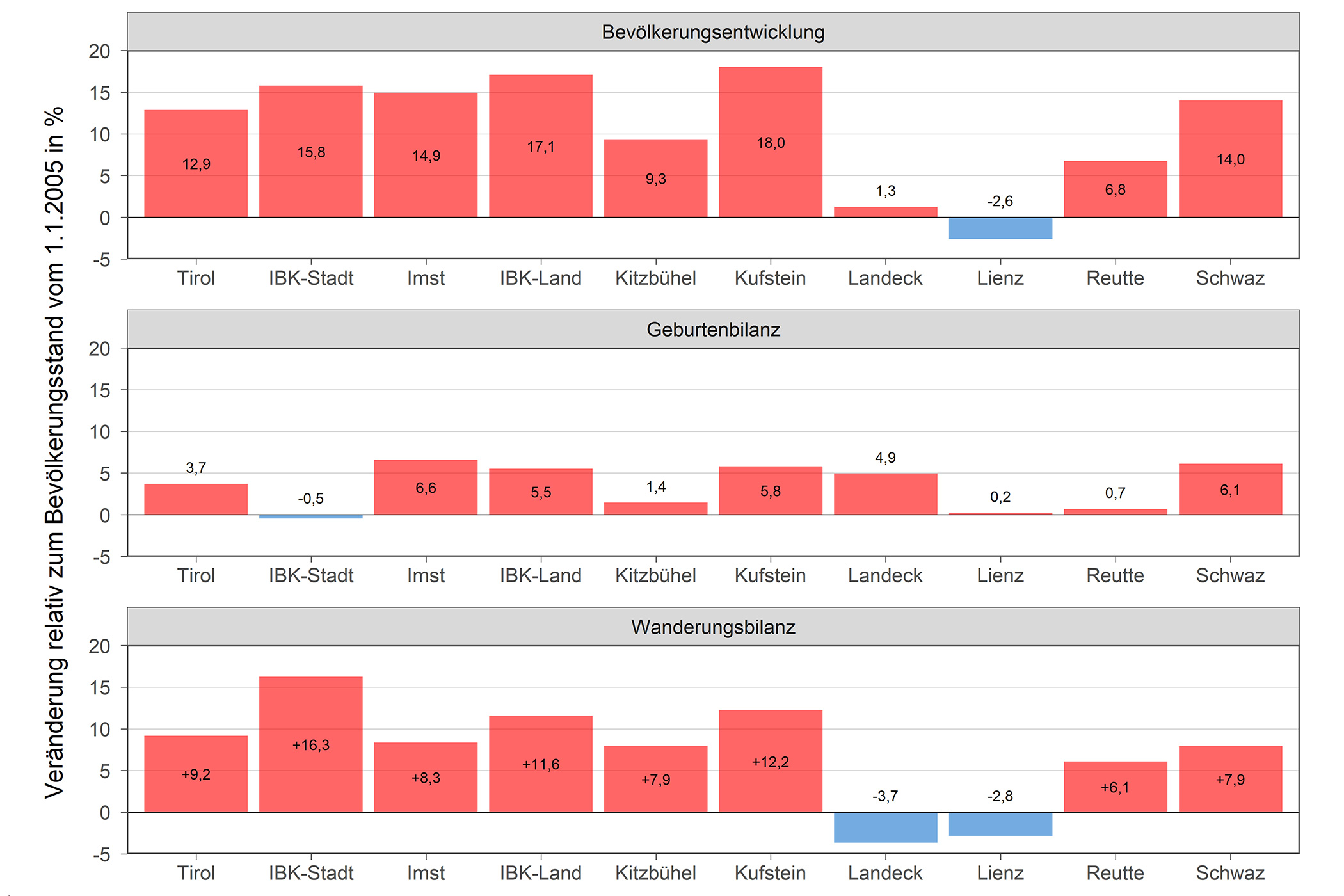Ein konträres Bild ergibt sich allerdings bei Betrachtung eines Längsschnittes: In den letzten 20 Jahren sank die Bevölkerung um 1.315 Einwohner:innen. Ursächlich dafür ist die negative Wanderungsbilanz - obwohl die Geburten die Todesfälle geringfügig übertrafen, zogen mehr Personen von Osttirol weg als nach Osttirol. Damit ist Lienz der einzige Tiroler Bezirk mit einer schrumpfenden Bevölkerung.