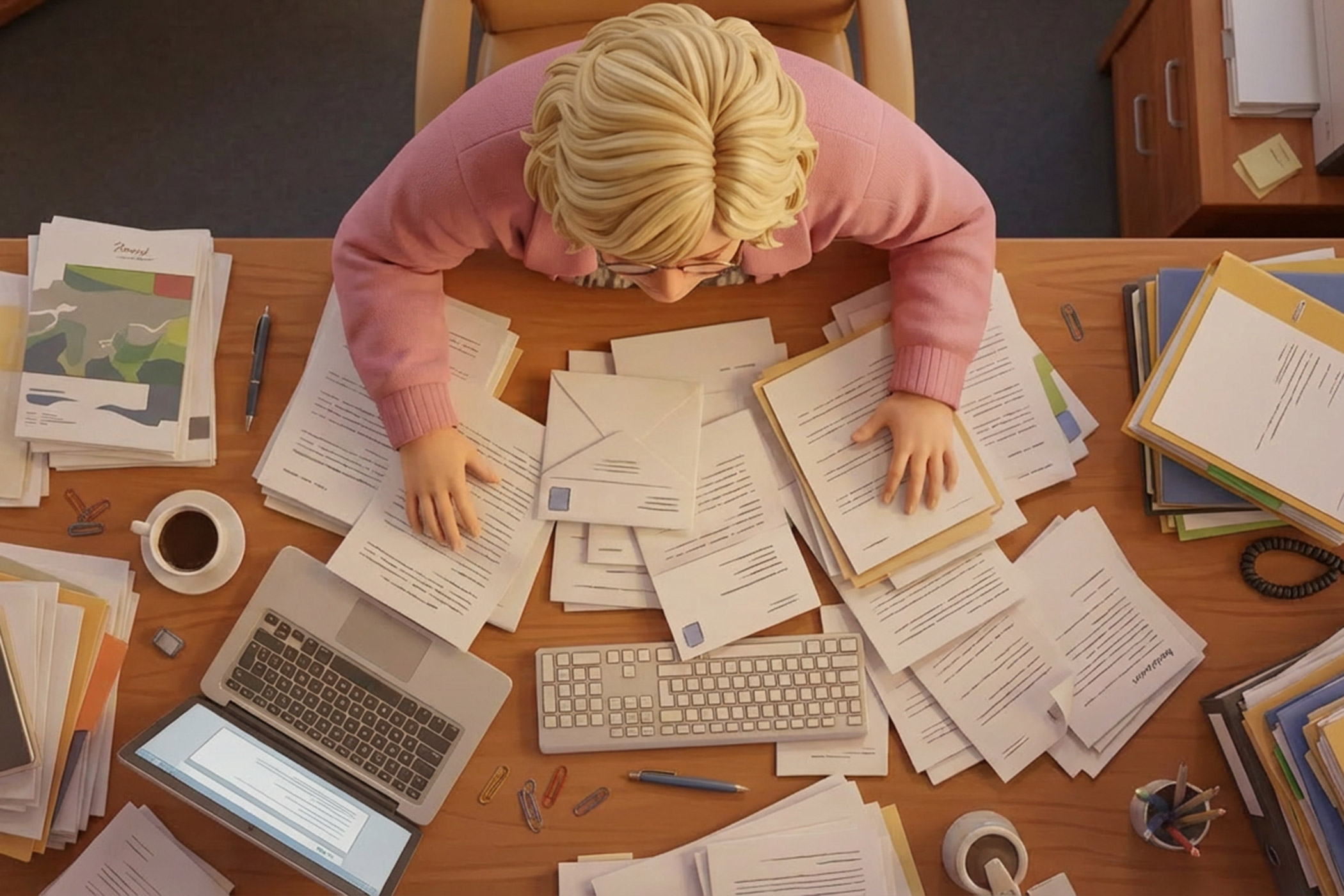 Beide beginnen zu suchen. Zwischen Briefstapeln, Aktenordnern, Post-its und alten Notizen wühlen sie sich durch das Chaos. Minuten verstreichen, bis die Bürgermeisterin plötzlich triumphierend ruft: „Da ist er!“ Sie zieht ein gefaltetes Blatt aus einem Stoß Unterlagen hervor und reicht es Lena.