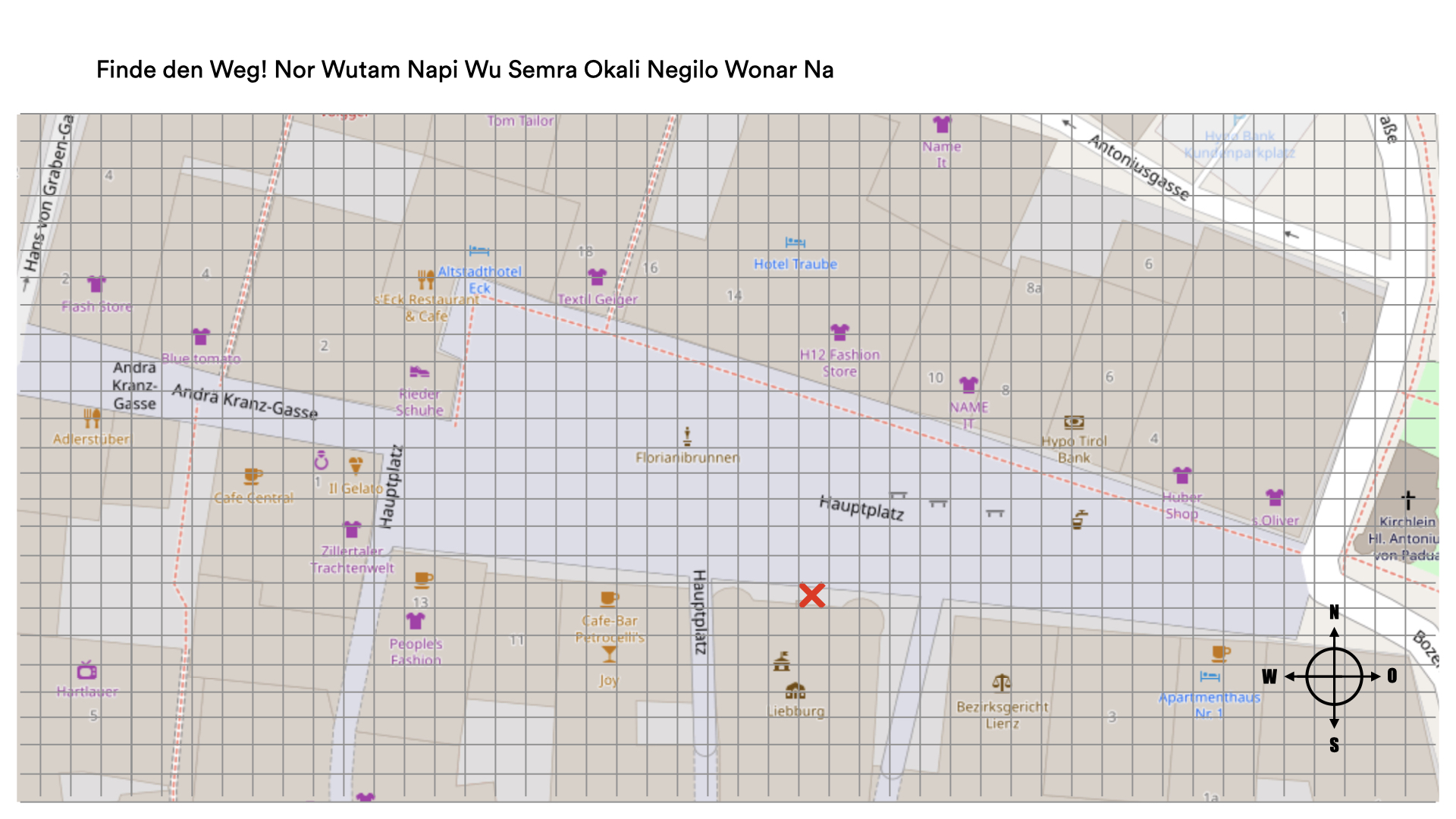 Neugierig breitet Lena den Stadtplan auf dem Tisch aus. Die Karte zeigt die Lienzer Innenstadt. Direkt vor der Liebburg ist ein X eingezeichnet. Dann sticht ihr die schwarze Schrift am oberen Rand ins Auge: „Finde den Weg!“. Danach steht eine seltsame Reihe von Worten: „Nor Wutam Napi Wu Semra Okali Negilo Wonar Na.“ Lena fährt mit dem Finger über die Buchstaben, als könnte sie dadurch Klarheit über ihre nächsten Schritte gewinnen.