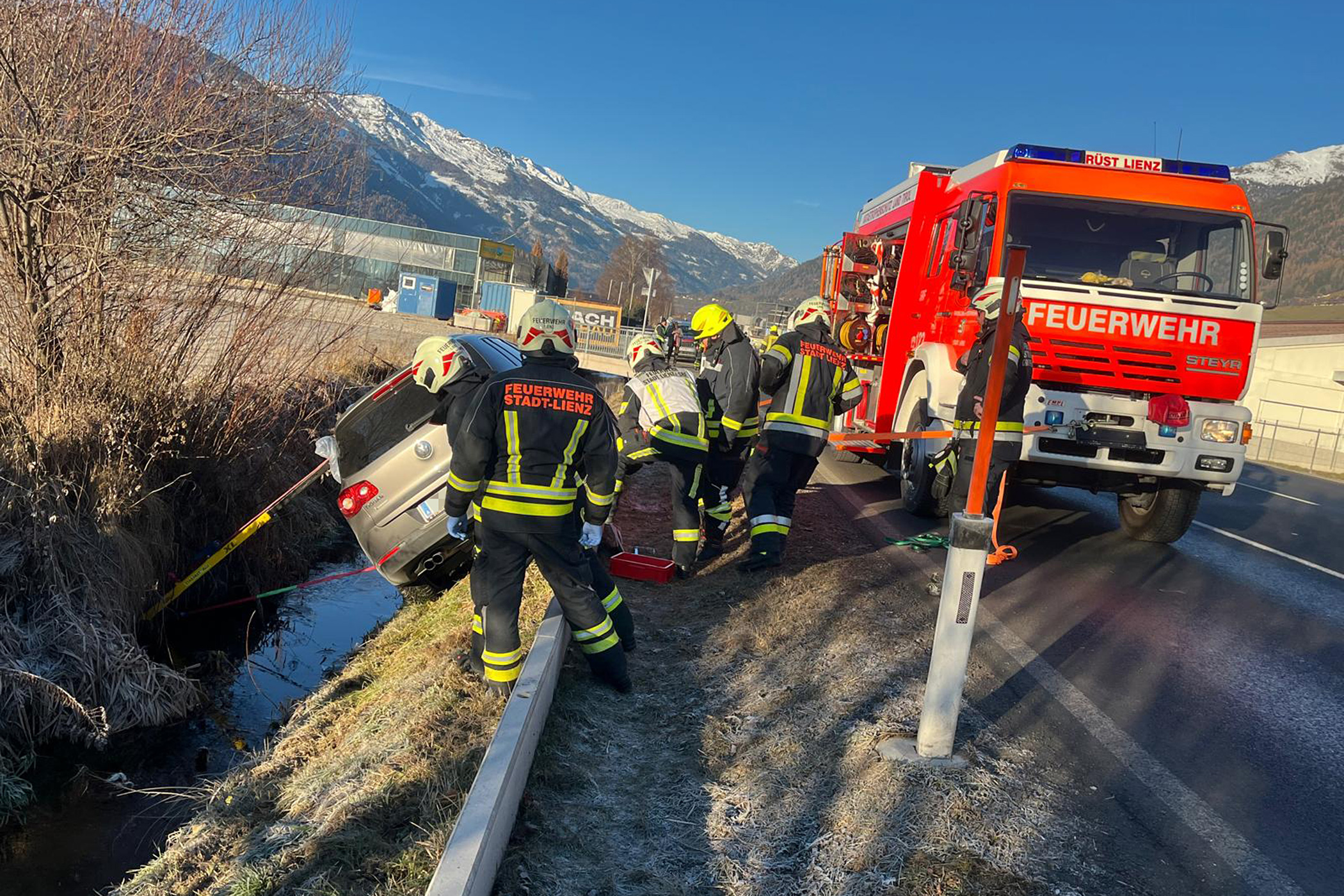Aus dieser Lage war ein selbstständiger Ausstieg für die betagte Lenkerin unmöglich. Die Freiwillige Feuerwehr Lienz sicherte das Fahrzeug und half der unverletzten Frau aus dem Wagen, der erheblich beschädigt und abgeschleppt wurde. Während der Bergungsarbeiten wurde der Verkehr umgeleitet.