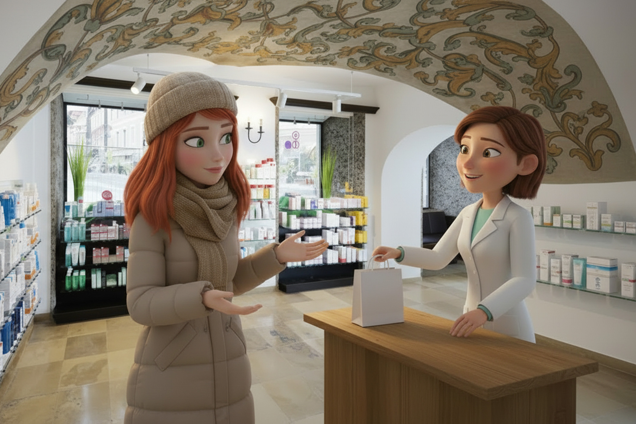 Die Apothekerin lächelt freundlich: „Hallo Lena, wieder zu Besuch bei deinen Großeltern?“ Lena nickt. „Ah, da fällt mir ein – für deine Oma haben wir noch ein Päckchen zum Abholen. Willst du es mitnehmen?“ Lena, die ohnehin schon ans Heimgehen denkt, nickt erneut. Die Apothekerin reicht Lena ein Sackerl über die Theke.