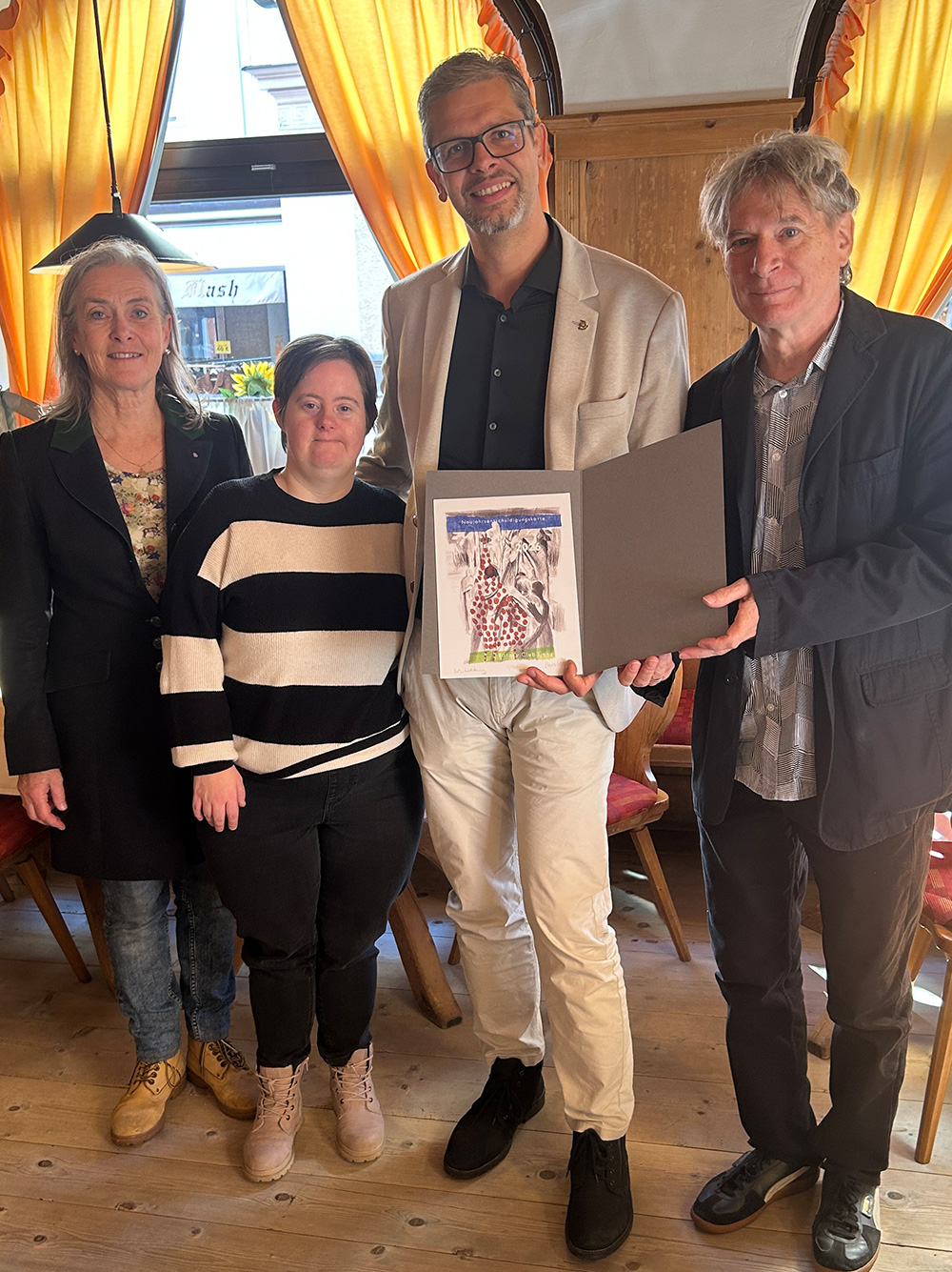 Für die diesjährige Neujahrs-Entschuldigungskarte haben sich zwei Lienzer Kunstschaffende zusammengefunden: Michael Hedwig und Beatrix Indrist. Gemeinsam schufen sie eine Lithografie, ausgeführt in farbiger Kreide auf Schwarz-Weiß. Das Kooperationsprojekt trägt den Titel „Garten mit Giraffen“. Der Reinerlös aus dem Verkauf der Karten kommt heuer dem Hospizteam Lienz/Osttirol zugute. Die Karten, jeweils von beiden Künstler:innen signiert, sind zum Preis von 50 Euro in der Lebenshilfe, im Bürgerservicebüro der Liebburg, bei Tyrolia sowie in der Trafik Dobnig erhältlich.