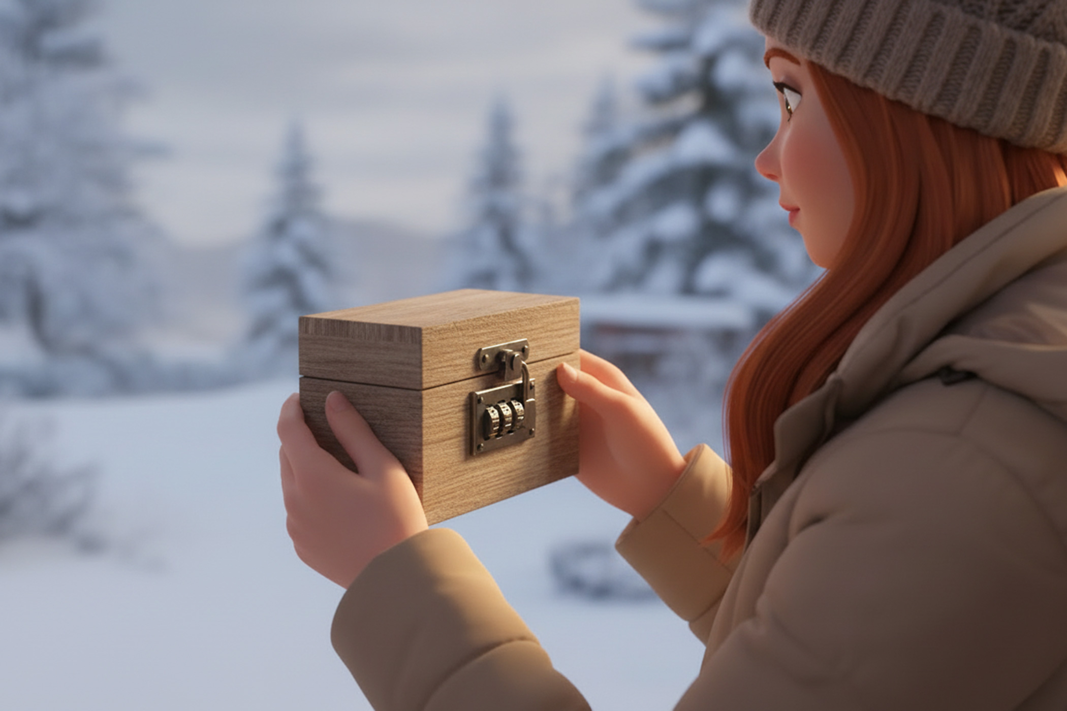 Lena zieht die Schatulle aus ihrer Jackentasche. Sie streift die Handschuhe ab und nimmt das Zahlenschloss in die Hand. Vorsichtig stellt sie die Zahlen 4-7-5 ein und das kleine Schloss klickt auf. Das Muster aus Pucks zeigt gespiegelte Zahlen.