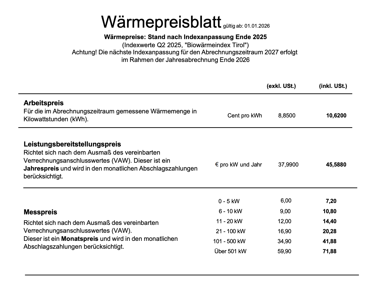 Diese Rechnung enthält nämlich mehrere Preiskomponenten, von denen nur eine mit dem tatsächlichen Verbrauch zusammenhängt. Schaut man sich das aktuelle Preisblatt der Stadtwärme Lienz an, dann gibt es dort einen „Arbeitspreis“, einen „Leistungsbereitstellungspreis“ und einen „Messpreis“. Nur der Arbeitspreis von 10,62 Cent pro Kilowattstunde inkl. MWSt. ab Jänner 2026 verrechnet die direkt gemessene Wärmemenge.