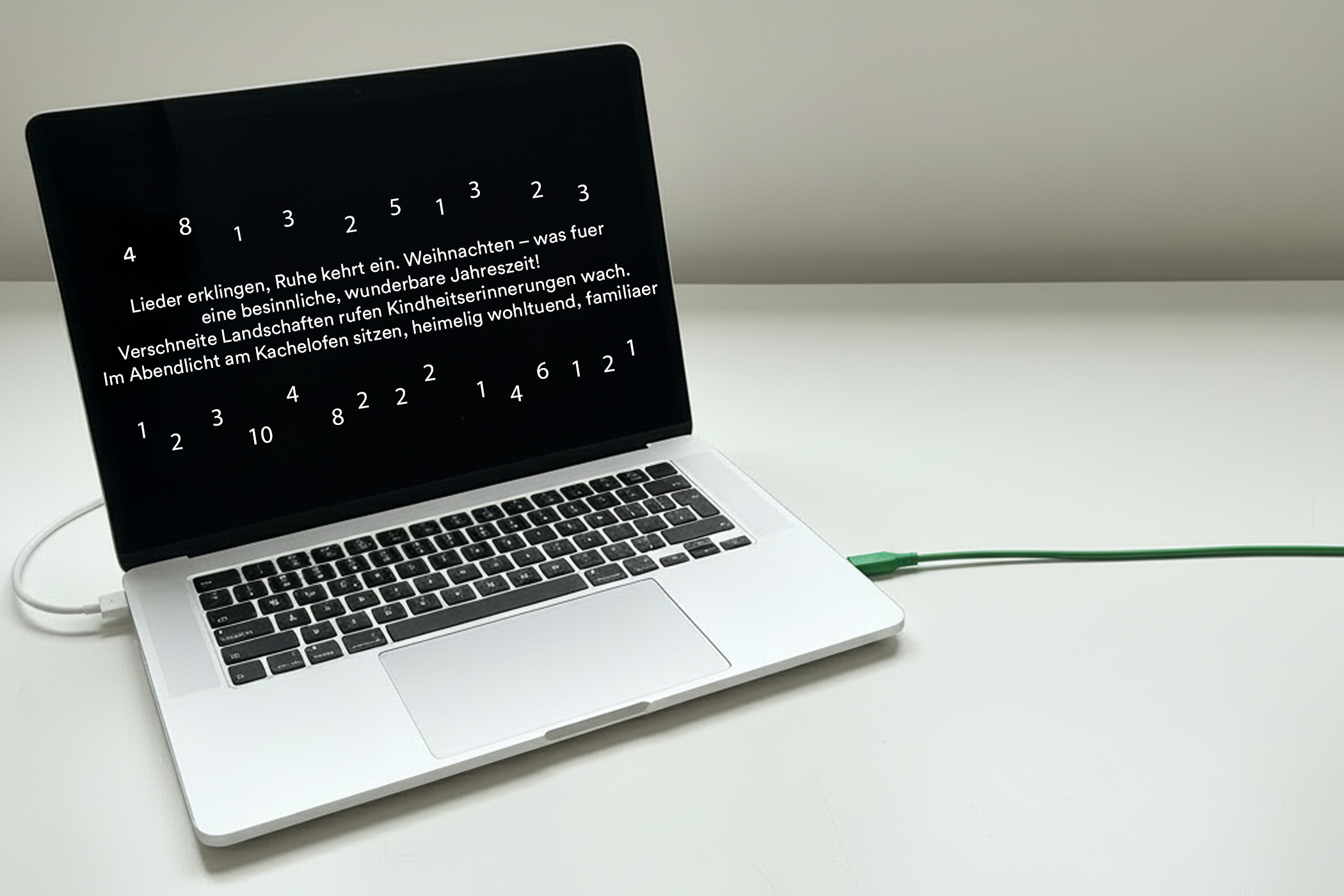 Er erinnert Lena sofort an ein Weihnachtsgedicht. Doch bevor sie zu lesen beginnt, bemerkt sie etwas Merkwürdiges. Rund um den Text tauchen Zahlen auf. Lena beugt sich näher zum Bildschirm und beginnt zu grübeln.