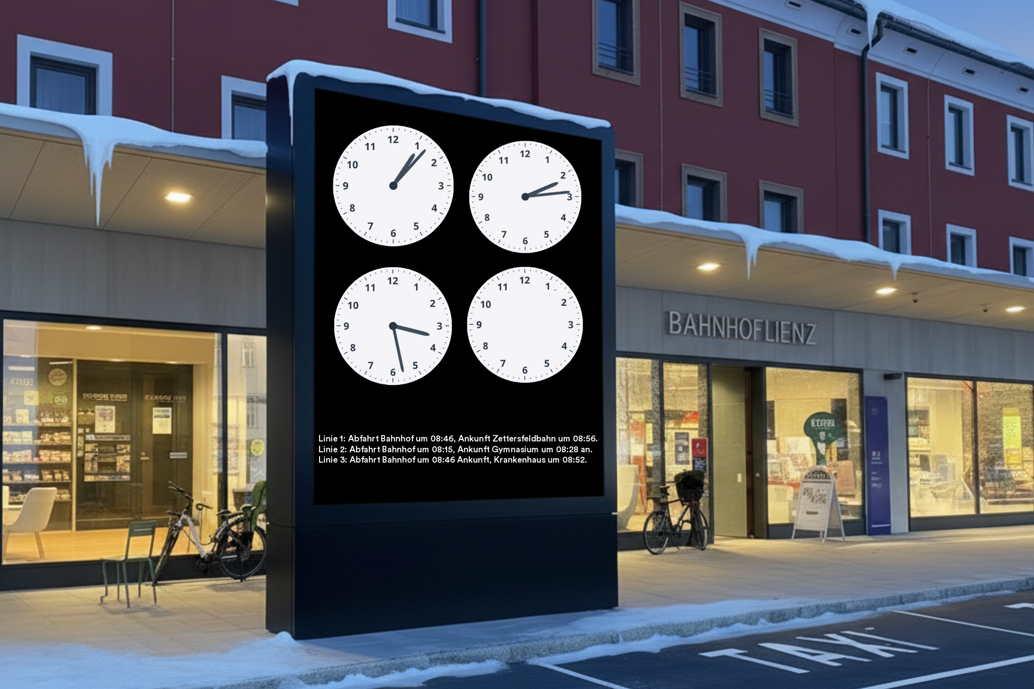 - Linie 3: Abfahrt Bahnhof um 08:46, Ankunft Krankenhaus um 08:52.