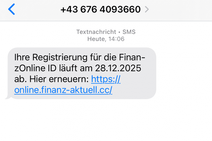 „Ihre Anmeldung für die Finanz Online-ID läuft ab“. So oder so ähnlich lauten betrügerische SMS-Nachrichten, die derzeit auch in Tirol wieder in Umlauf sind. Klicken Sie keinesfalls auf den mitgeschickten Link! Am besten Nachricht sofort löschen und Absender blockieren.
