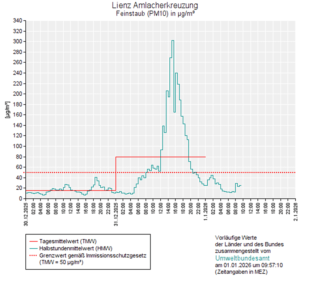 Der im Immissionsschutzgesetz-Luft festgelegte Feinstaub-Grenzwert von 50 µg pro Kubikmeter im Tagesmittel wurde in Lienz am 31. Dezember um das Sechsfache überschritten und erreichte in einer ab Mittag steil ansteigenden Kurve gegen 16.00 Uhr mit knapp mehr als 300 µg pro Kubikmeter seine Spitze.