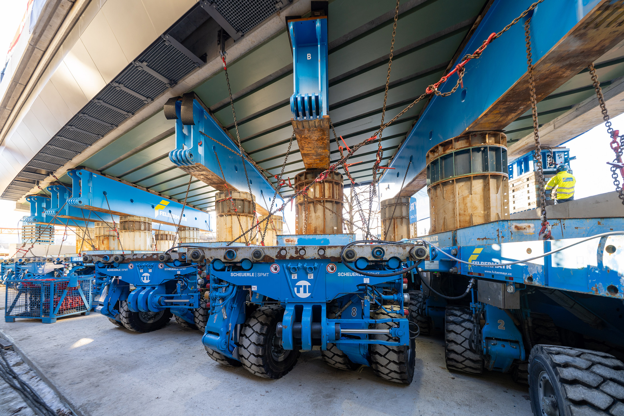 Mit Spezialpressen und 112 einzeln gesteuerten Räderpaaren wurde am Sonntag, 18. Jänner, die rund 1.400 Tonnen schwere Rauchmühlbrücke in Innsbruck an ihrer neuen Position eingepasst. Der Koloss war zuvor auf fünf Meter Höhe gehievt worden, mit Transporteinheiten wurde das Tragwerk dann rund 100 Meter über die Hallerstraße bis zu den Brückenwiderlagern gefahren. Nach einer Drehung um 90 Grad hatte die Brücke millimetergenau die endgültige Position gefunden, berichteten die ÖBB in einer Presseaussendung.
