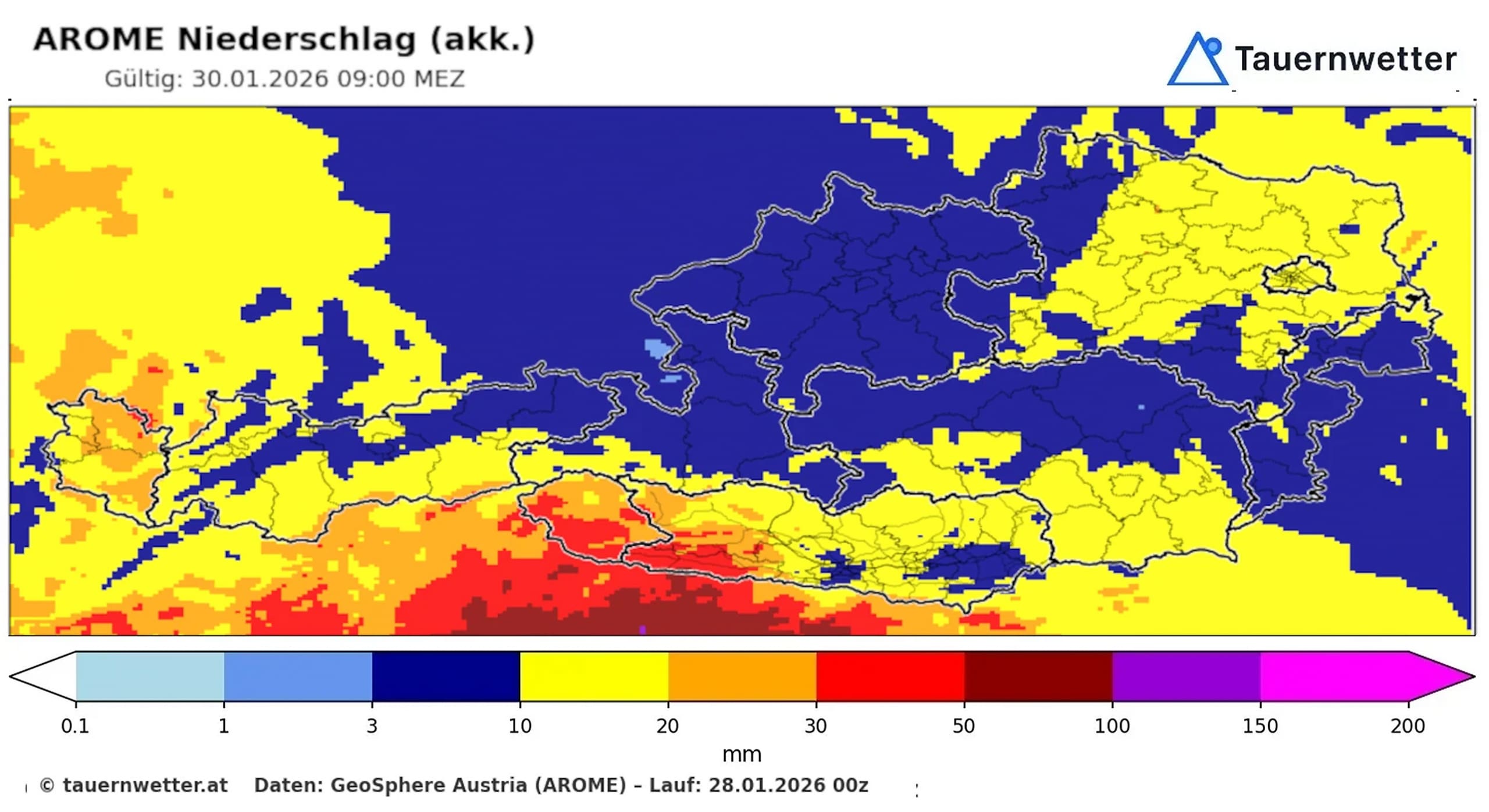Der Wetterdienst Tauernwetter.at kündigt für heute Mittwoch und morgen Donnerstag, den 29. Januar, zwischen zehn und 20 Zentimeter Neuschnee in Oberkärnten und Osttirol an. Heute Nachmittag und Abend sollte es ohne Unterbrechung Niederschlag geben. Am Donnerstag schneit es zeitweise leicht bis mäßig weiter. Westlich der Linie Spittal–Hermagor sinkt die Schneefallgrenze immer wieder bis in tiefe Lagen, sonst liegt sie zwischen 1.000 und 1.200 Meter Seehöhe.