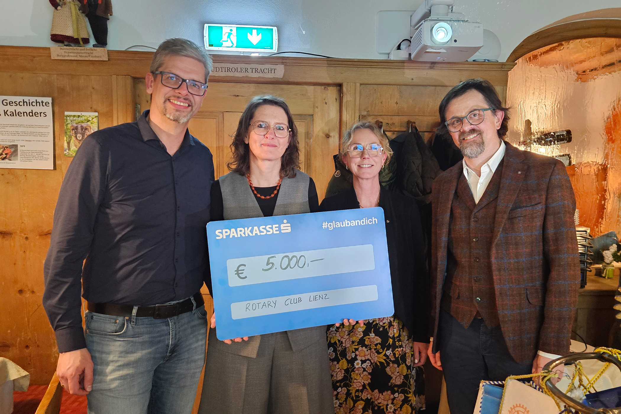 Der Reinerlös aus dem Verkauf der Karten kommt in diesem Jahr dem Hospizteam Lienz/Osttirol zugute, das schwerkranke Menschen sowie deren Angehörige unterstützt und begleitet. Nach einem Vortrag über die Tiroler Hospizbewegung wurde im Rahmen des wöchentlichen Rotary-Meetings der Spendenscheck in der Höhe von 5.000 Euro an Christine Ganeider und Marlen Resinger für die Hospizbewegung im Bezirk Lienz übergeben.