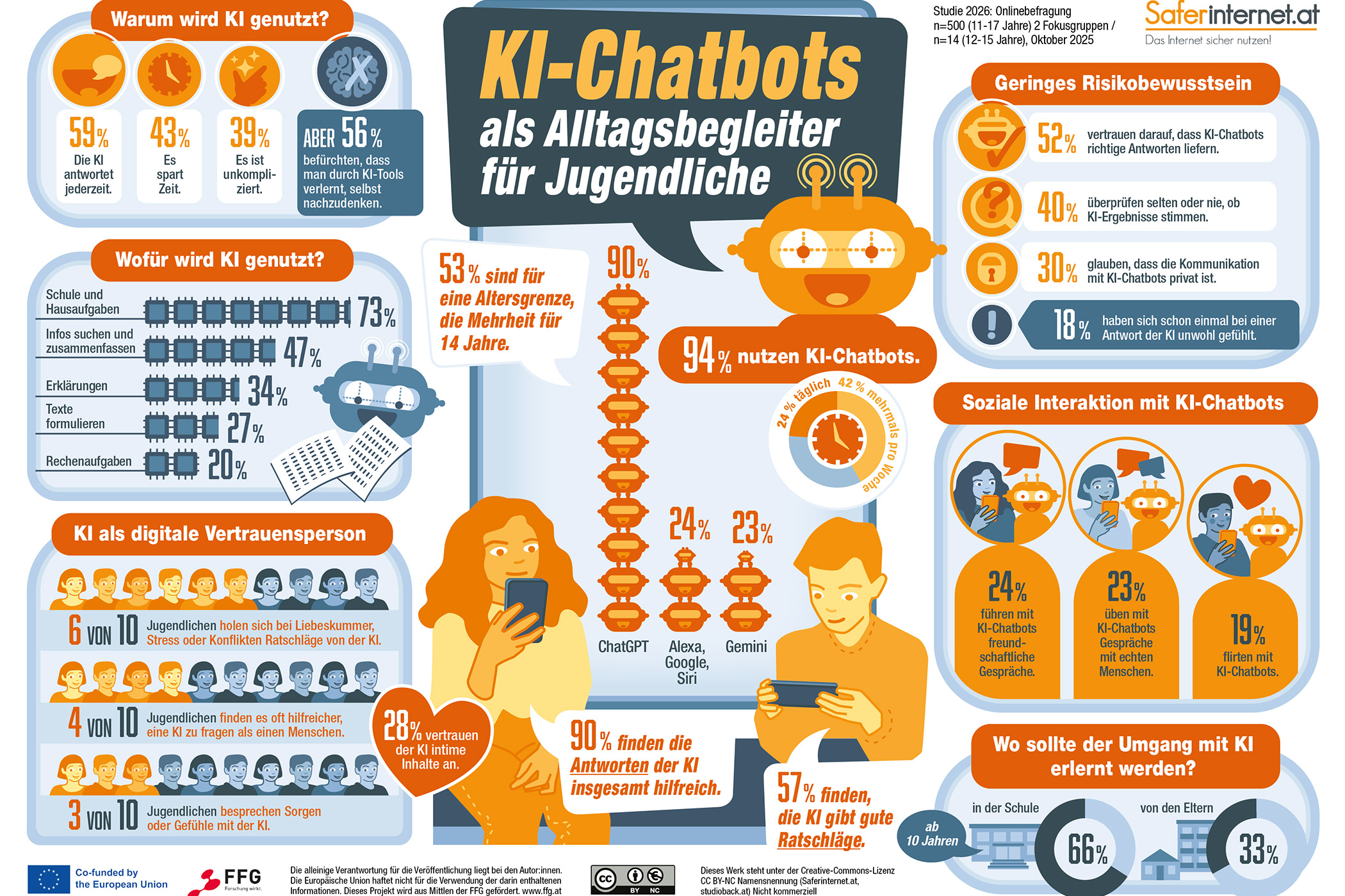Die Studie „KI-Chatbots als Alltagsbegleiter für Jugendliche“ wurde vom Institut für Jugendkulturforschung und Kulturvermittlung im Auftrag des Österreichischen Instituts für angewandte Telekommunikation (ÖIAT) und der ISPA – Internet Service Providers Austria im Rahmen der EU-Initiative Saferinternet.at durchgeführt. Im Befragungszeitraum (Oktober/November 2025) nahmen 500 Jugendliche im Alter von 11 bis 17 Jahren, repräsentativ nach Alter, Geschlecht und Bildungshintergrund, teil. Zusätzlich wurden zwei Fokusgruppen in Jugendeinrichtungen mit insgesamt 14 Jugendlichen zwischen 12 und 15 Jahren durchgeführt.