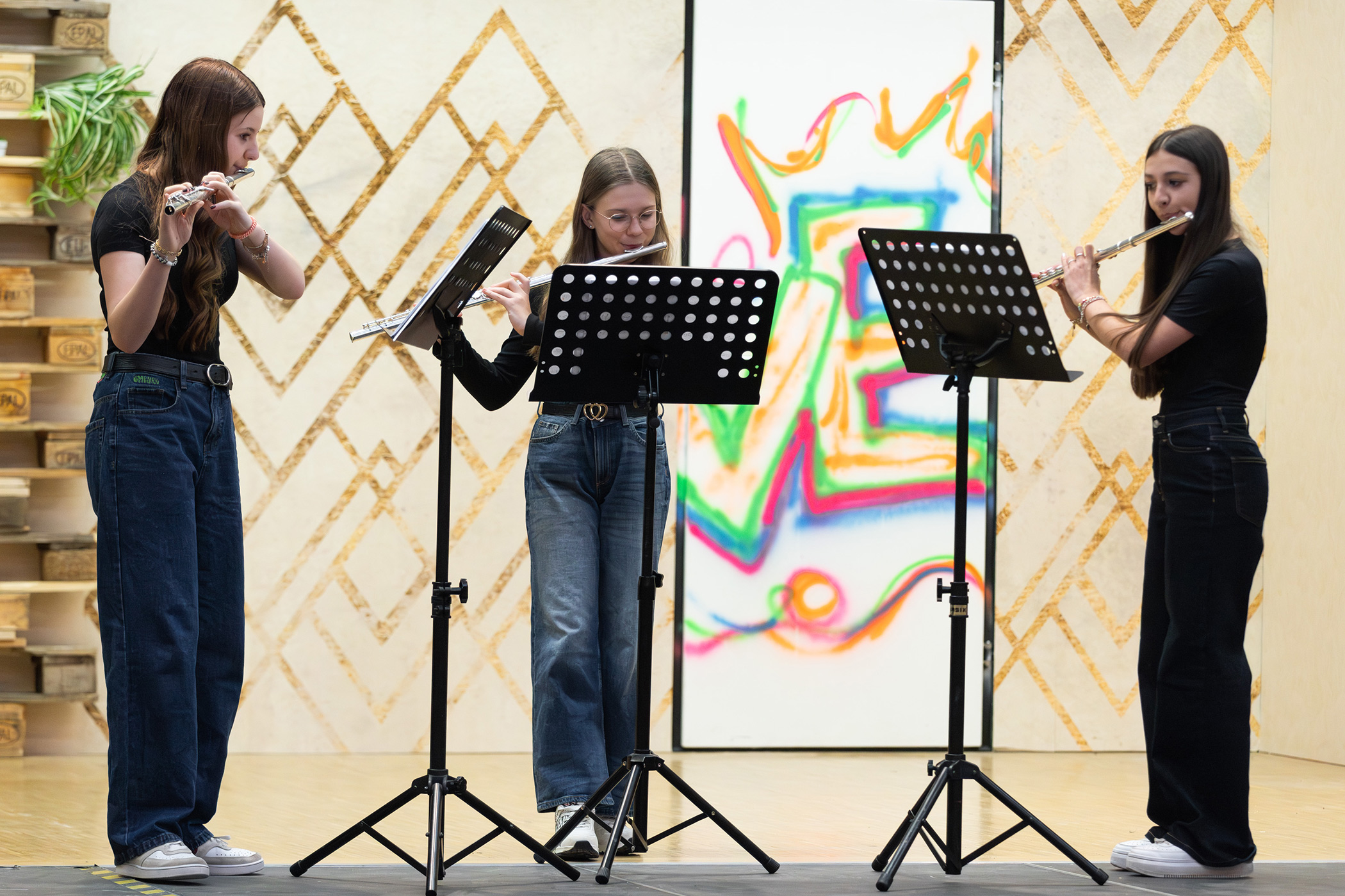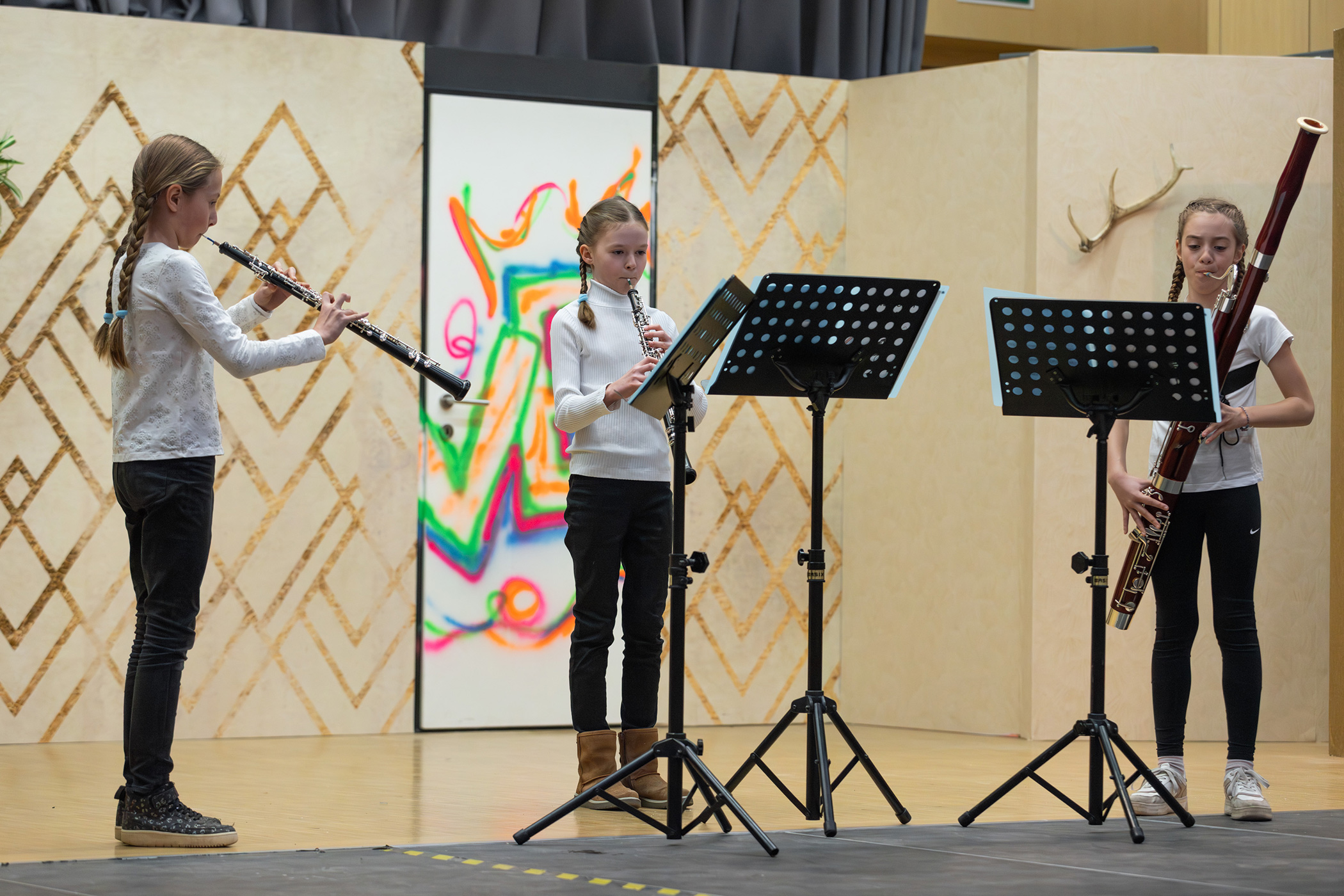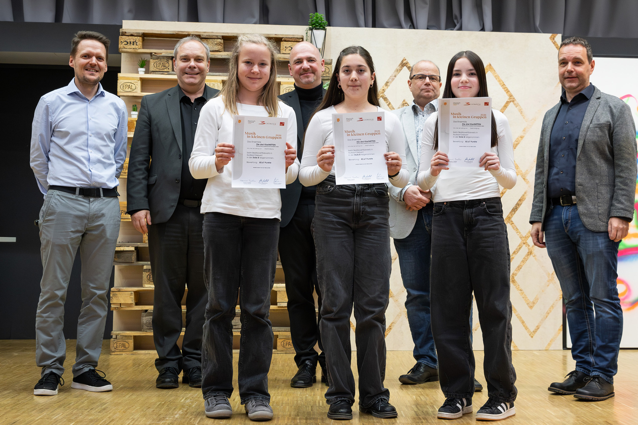 In der gleichen Kategorie traten „Die Notenfresserinnen“ Laura Weiler, Leonie Jost und Vilma Vavrova mit ihren Doppelrohrblattinstrumenten und den Lehrpersonen Anna-Maria Unterrieder und Helmut Beham an. Sie erreichten 84,67 Punkte.