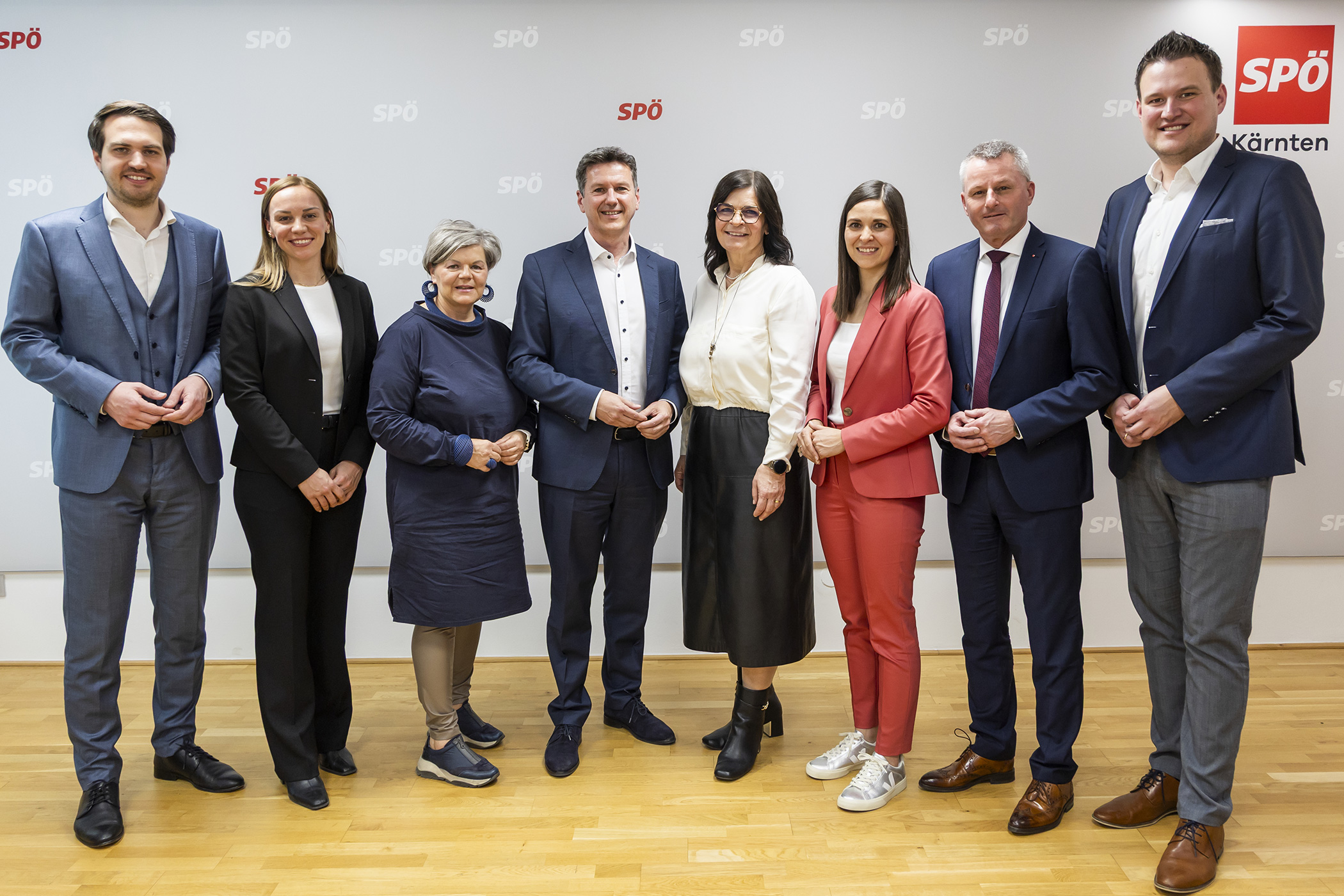 Das nach dem Rücktritt von Landeshauptmann Peter Kaiser neue Team der SPÖ Kärnten mit Klubobmann Luca Burgstaller, Klubobmann-Stellvertreterin Manuela Lobnig, Ersatz-Landesrätin Ruth Feistritzer, Landesparteiobmann Daniel Fellner, Landesrätin Marika Lagger-Pöllinger, Landtagsabgeordnete Christina Patterer, Dritter Landtagspräsident Günter Leikam und Landesgeschäftsführer David Pototschnig am Dienstag, 10. März 2026 im Rahmen der Pressekonferenz nach der Sitzung des Parteivorstandes der SPÖ Kärnten zum Thema „Teamstruktur nach dem Landeshauptmannwechsel“.
