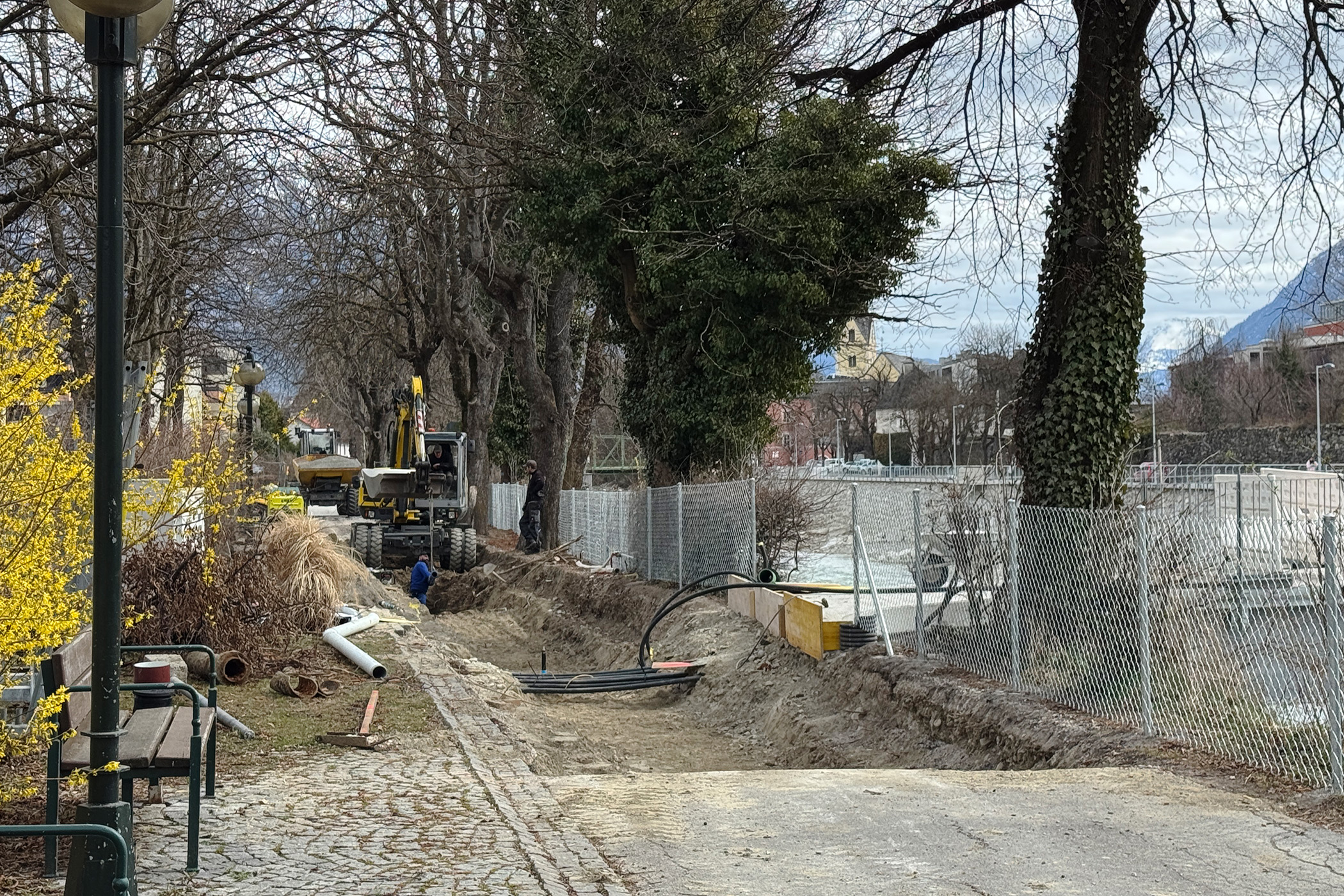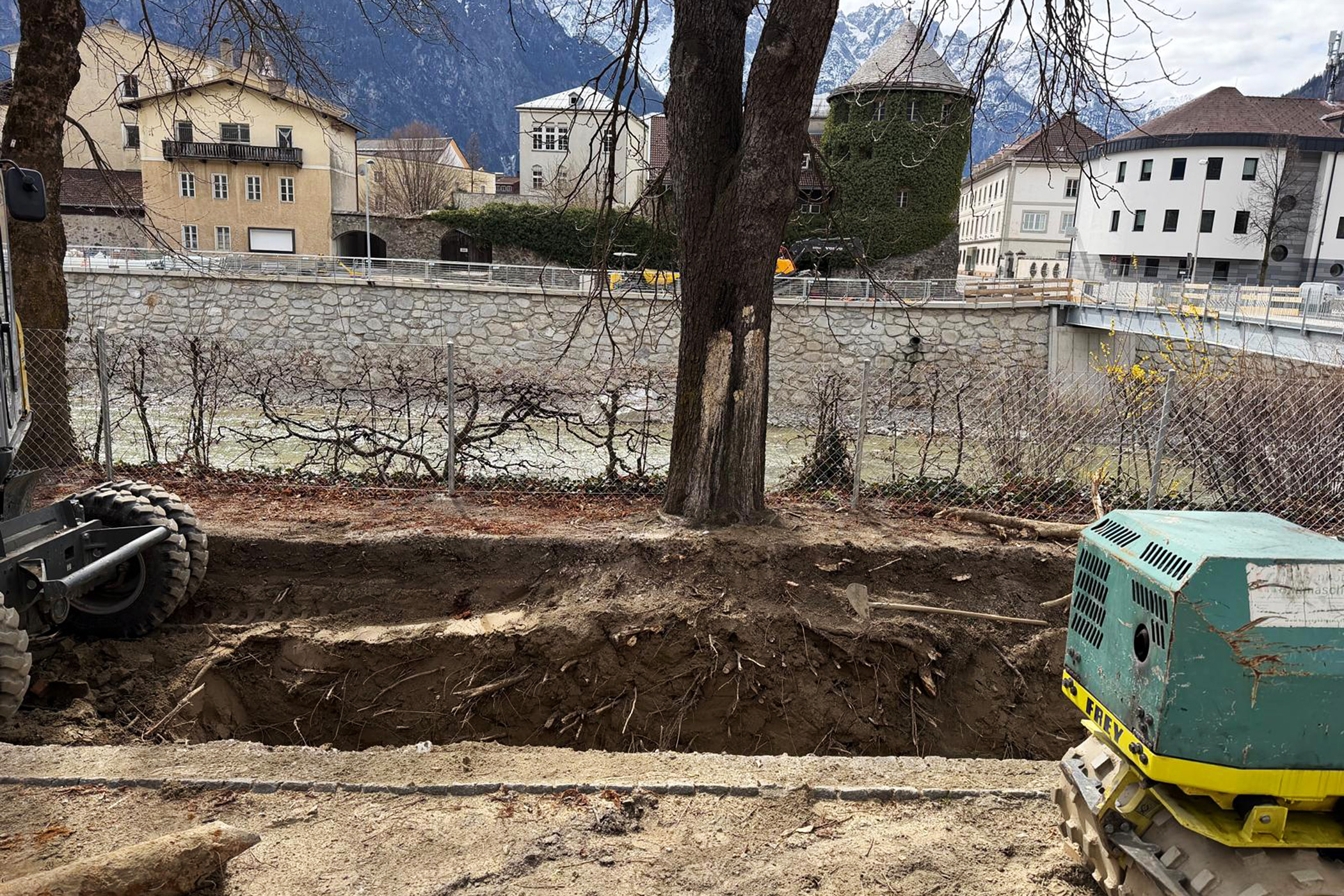 Diese Grabungen, von denen bislang beim Timing für die Steg-Eröffnung eigentlich nie die Rede war, beunruhigen vor allem am Iselkai zwischen dem Steg und dem Pegelhäuschen die Naturschützer. Große Bagger graben sich dort tief ins Erdreich und geraten dabei mit ihren Schaufeln gefährlich nahe an die Wurzeln der alten Alleebäume am Ufer.