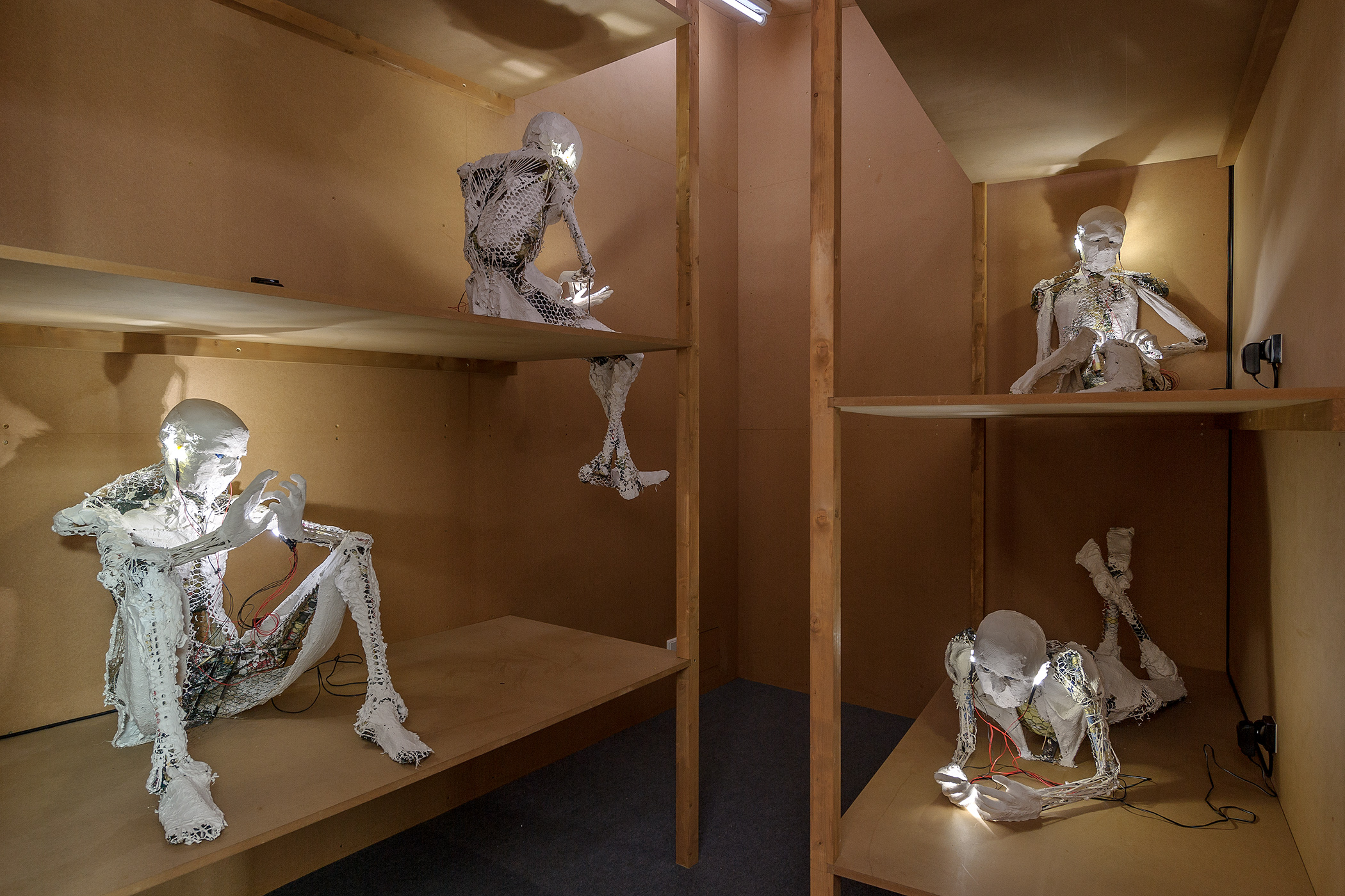 Menschliche Figuren, deren Skelett mit Hasengitter und einer fragmentierten Schicht aus Gips umhüllt ist, posieren, den Oberkörper tief gebeugt, im Schneidersitz am Boden, in entspannter Haltung, und, um die Hände von Zwängen der Statik zu entlasten, die Ellenbogen symmetrisch auf die weit auseinandergespreizten Knie gestützt. Manche liegen auf dem Bauch und wieder andere stehen. Die Variationen von Haltung und Bewegung sind dem Bedienen digitaler Endgeräte geschuldet. Diese sind selbst nicht sichtbar, leuchten ihren Benutzern jedoch aus LEDs und manchmal auch aus gewöhnlichen Glühbirnen entgegen.