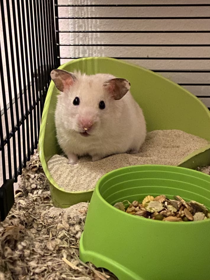 Ein zutraulicher, handzahmer Hamster sucht ein Zuhause. Käfig inkl. Transportbox, Zubehör und Futter günstig abzugeben!