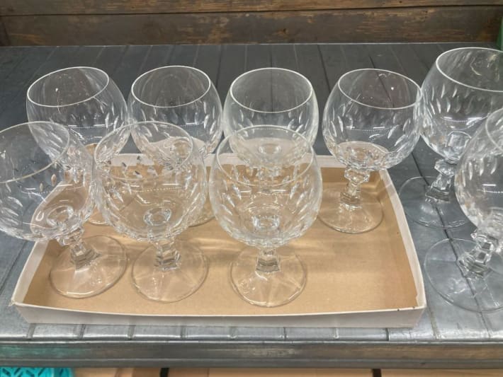 Mit Kristallstiel „Art Deco“, 3 große H 14cm und 7 kleinere H 13cm, einzeln je € 2,-