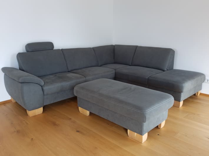 Ecksofa 286 x 236 cm, Hocker 132 x 68 cm, 2 Klappkästen, 1 Schubkasten, Microfaser, neuwertig, wegen Umzug zu verkaufen.