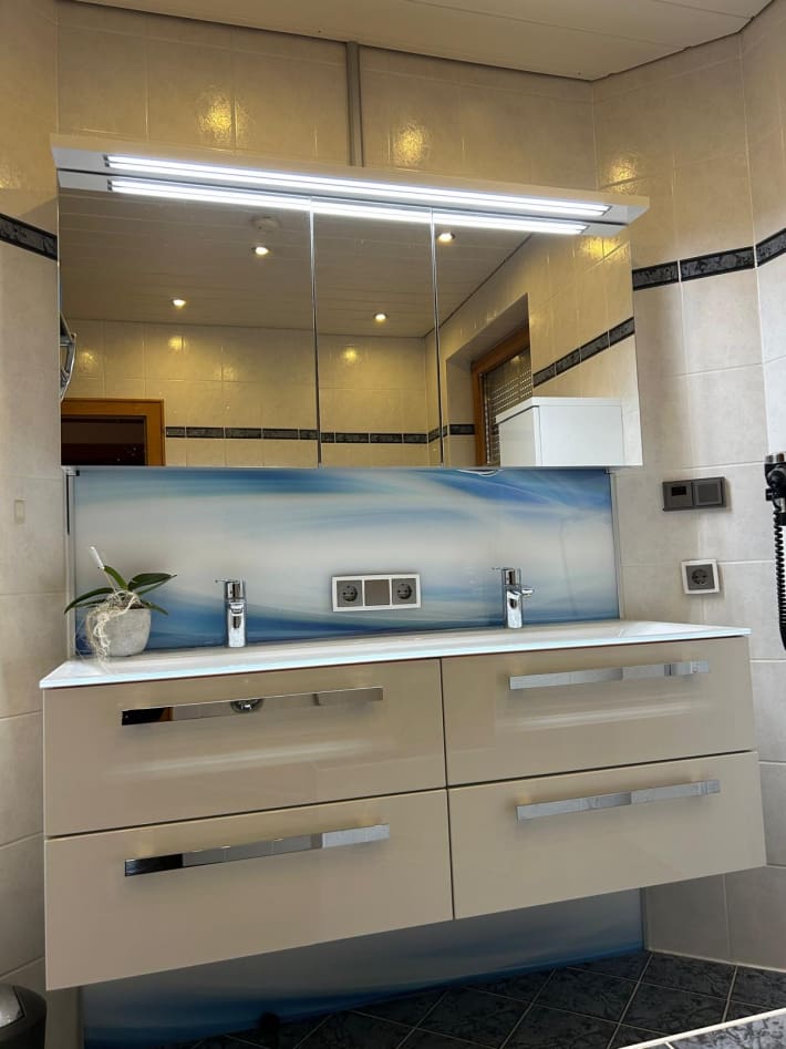 Doppelwaschtisch in weiß Hochglanz mit Spiegelschrank 140 cm breit Hängeschrank 130/30 cm NP: € 2500,- VP: € 400,- VHB