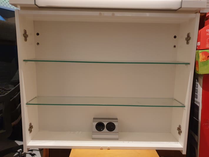 Spiegelschrank Breite 80 cm, Tiefe 20,5 cm, Höhe 71 cm, 2 türig. innen und außen als Spiegel. Steckdose/Lichtbalken