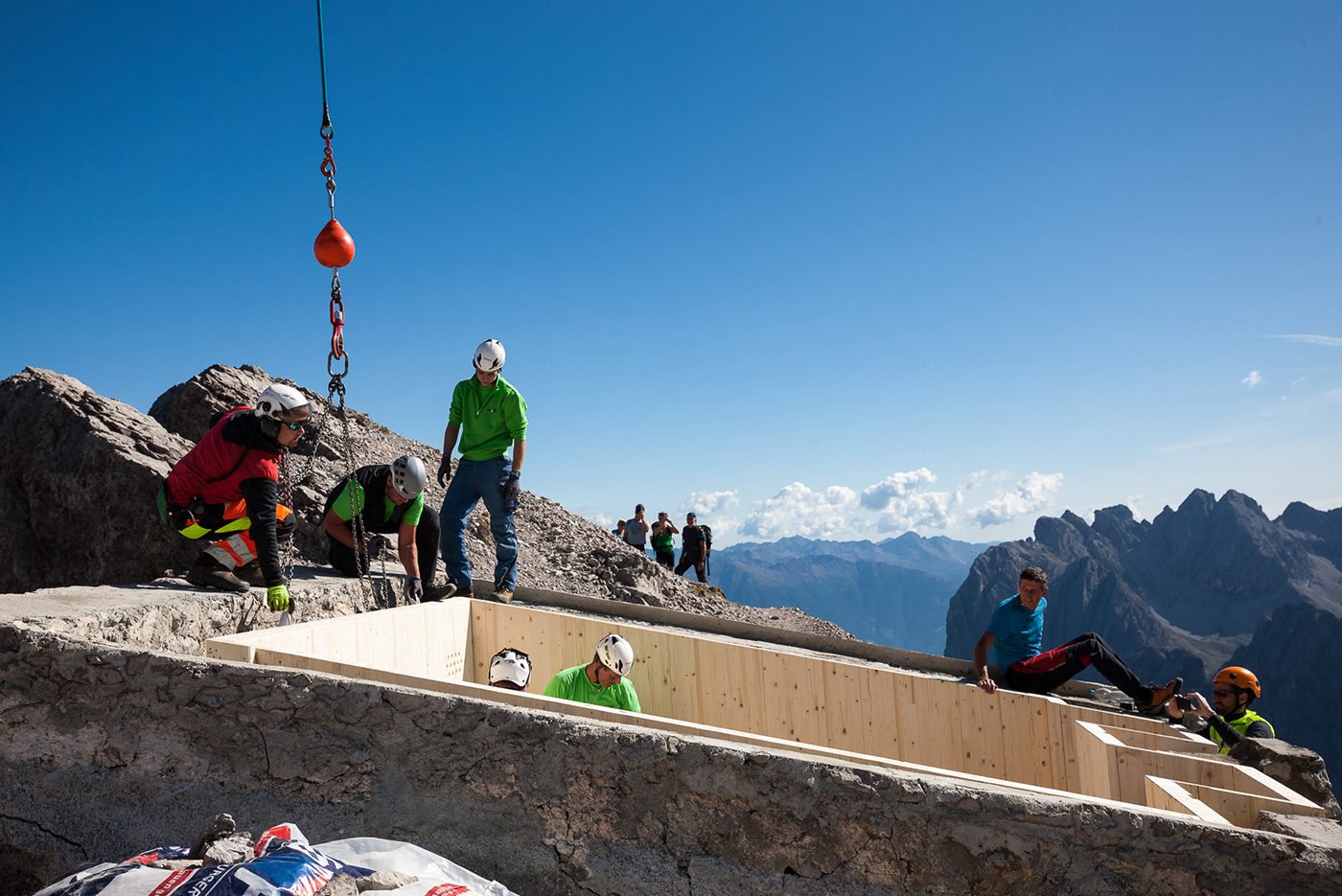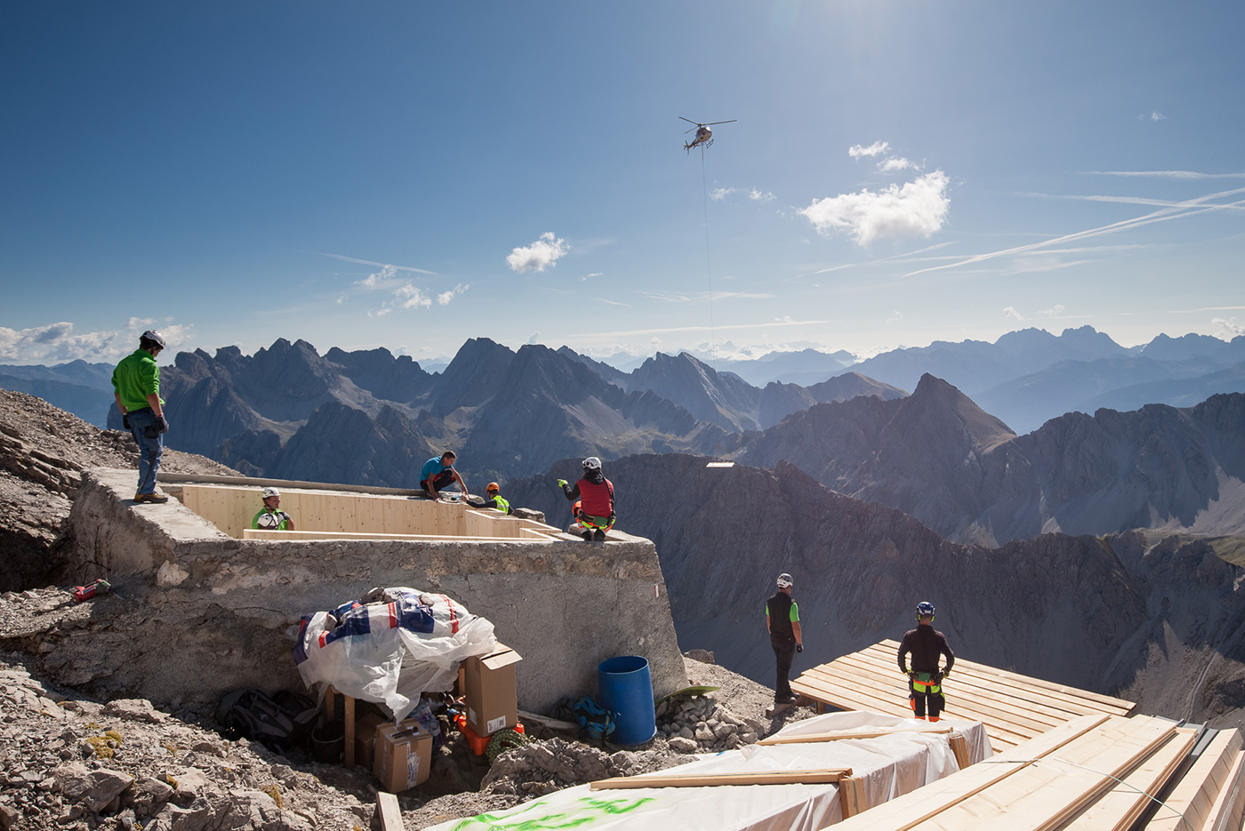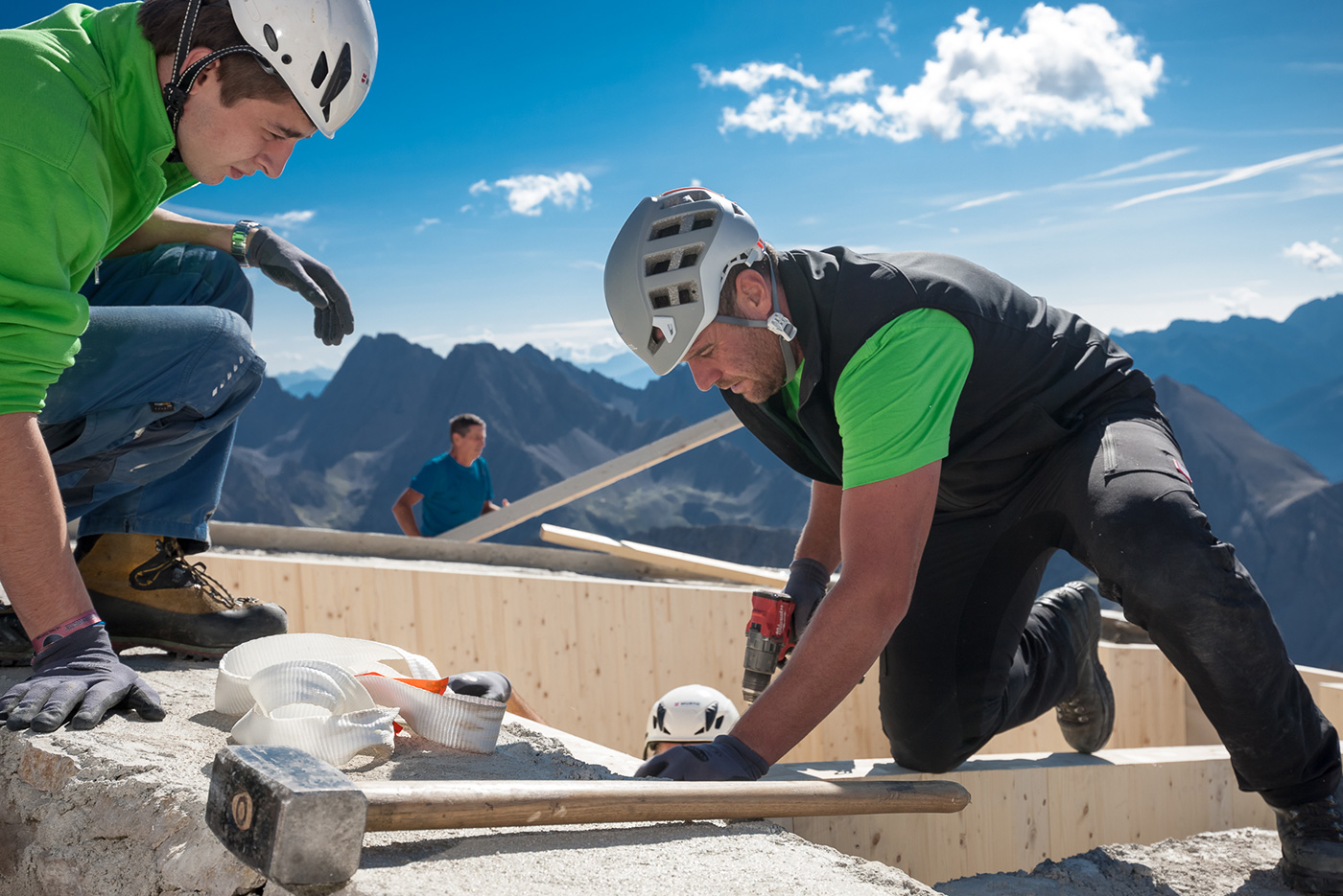 Die Idee: Die alte Steinhütte wurde innen komplett mit Holz verkleidet und damit quasi auch thermisch saniert. Dazu fertigte die Firma Holzbau Duregger im Bausatzsystem eine „Holzbox“ an, die – zerlegt in Einzelteile – per Hubschrauber an ihren neuen Bestimmungsort geflogen wurde. In luftiger Höhe wurden die maßgeschneiderten Holzbauteile zusammengefügt und im nächsten Arbeitsgang gleich von der Spenglerei Dorer das Hüttendach eingedeckt und winterfest gemacht. Selbst mit modernen Mitteln ist eine Baustelle in dieser Höhe eine Herausforderung, zumal das Wetter hier eine zentrale Rolle spielt und die Zeitfenster für Bauarbeiten entsprechend kurz sind.