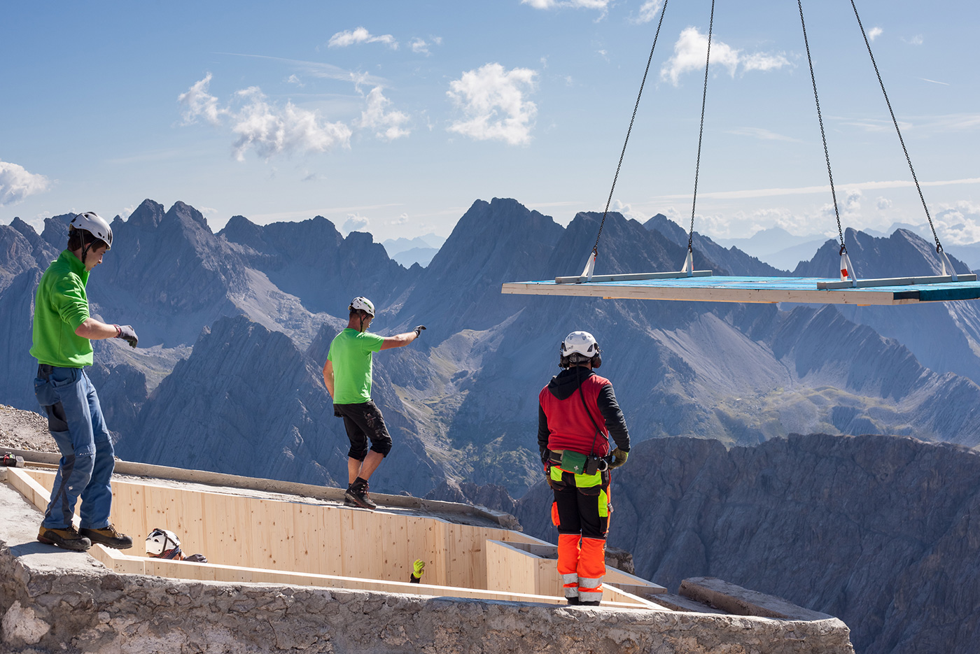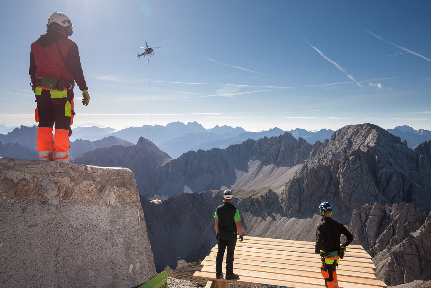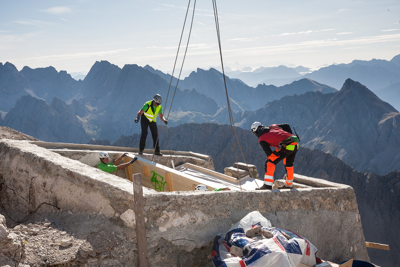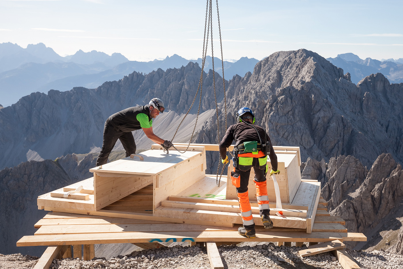 Die Idee: Die alte Steinhütte wurde innen komplett mit Holz verkleidet und damit quasi auch thermisch saniert. Dazu fertigte die Firma Holzbau Duregger im Bausatzsystem eine „Holzbox“ an, die – zerlegt in Einzelteile – per Hubschrauber an ihren neuen Bestimmungsort geflogen wurde. In luftiger Höhe wurden die maßgeschneiderten Holzbauteile zusammengefügt und im nächsten Arbeitsgang gleich von der Spenglerei Dorer das Hüttendach eingedeckt und winterfest gemacht. Selbst mit modernen Mitteln ist eine Baustelle in dieser Höhe eine Herausforderung, zumal das Wetter hier eine zentrale Rolle spielt und die Zeitfenster für Bauarbeiten entsprechend kurz sind.