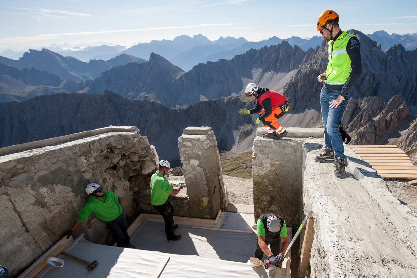 Die Sektion Lienz des Österreichischen Touristen Klubs (ÖTK) als Eigentümer und die Mitglieder der Osttiroler Plattform Architektur entwickelten im Sommer 2019 gemeinsam mit einer ganzen Reihe von Osttiroler Spezialfirmen und vielen Freiwilligen eine generalstabsmäßig geplante Sanierungsoffensive, die Mitte September über die hochalpine Bühne ging. Zunächst bereiteten Helfer – angeführt von den Baufirmen Frey und Bodner – das Mauerwerk und die Fundamente für die weiteren Arbeiten vor. Am 17. September folgte der spektakulärste Schritt der Arbeiten, dokumentiert von Landschafts- und Architekturfotograf Wolfgang C. Retter.