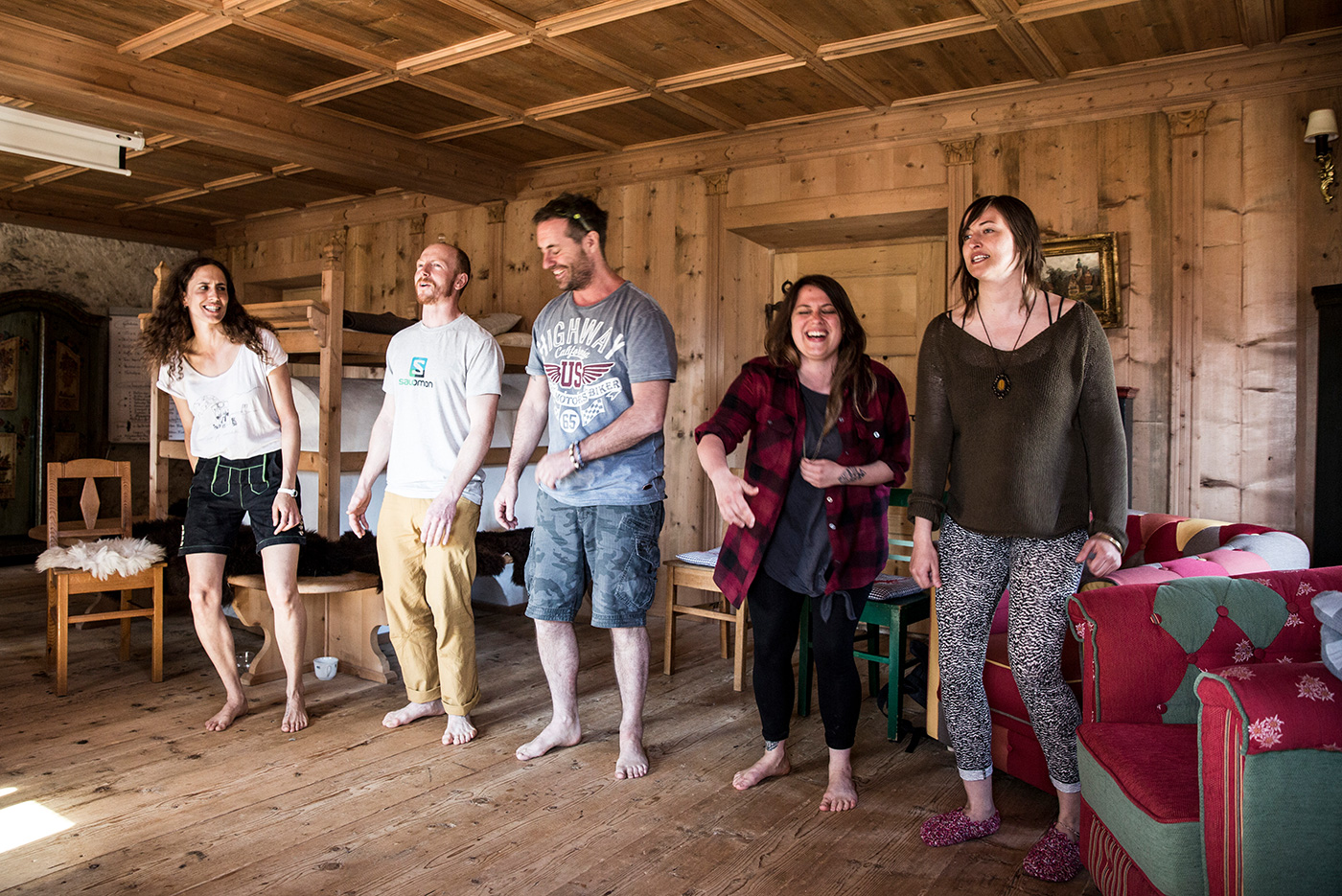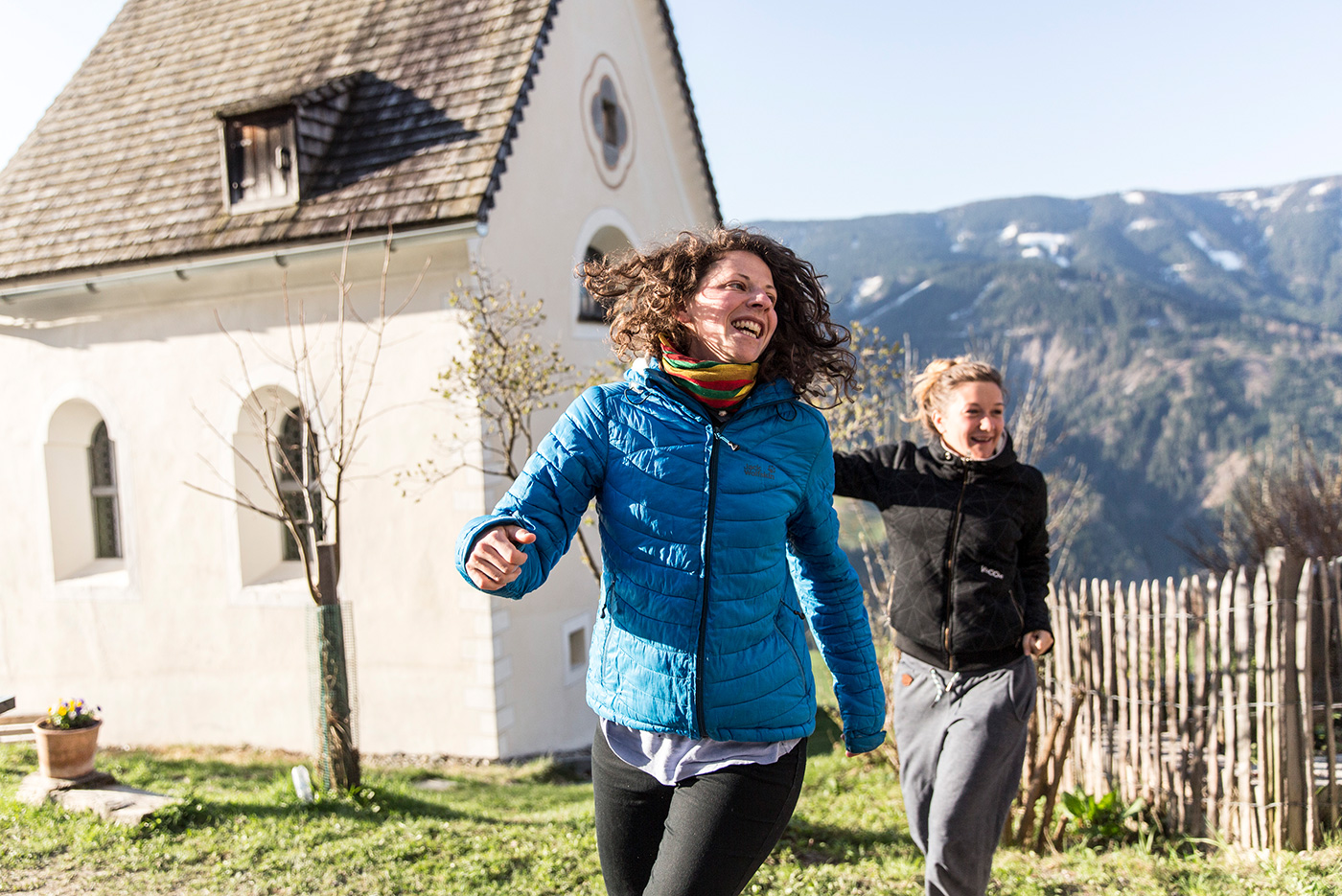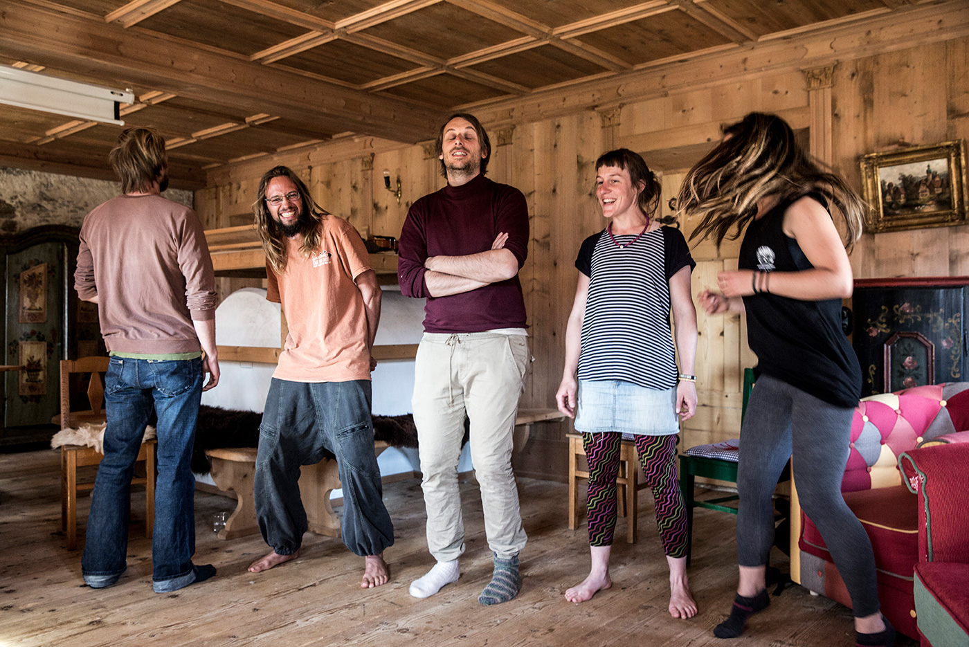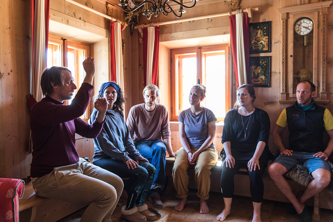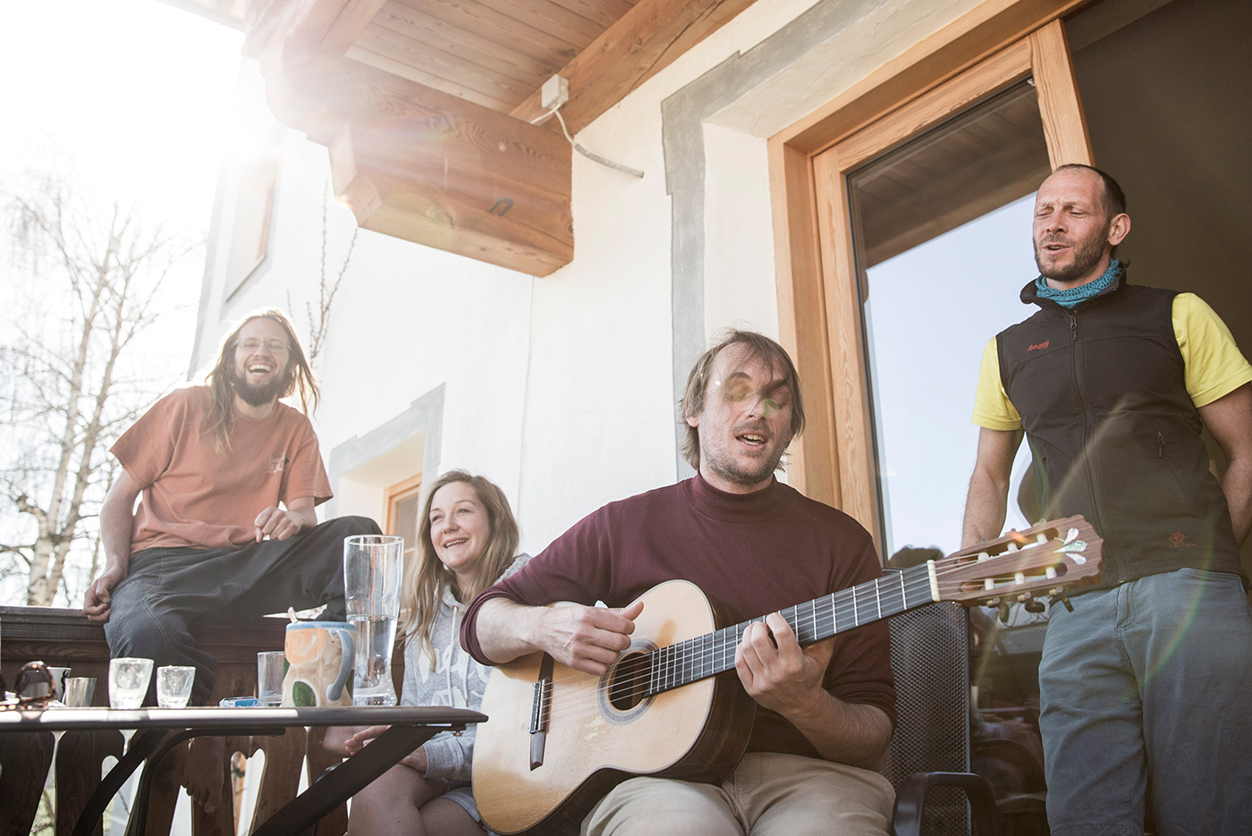 Wir treffen uns am Kollreidhof in Anras. Auf dem Weg dorthin wird die Straße immer enger und schlechter und gerade als wir uns fragen, ob wir uns vielleicht verfahren haben, merken wir: Wir sind angekommen. Der steile Wald lichtet sich und vor uns steht der malerische Hof mit seinem Wohn- und Stallgebäude und der Kapelle inmitten einer wundervollen Kulisse. In den kommenden zwei Tagen wird uns der Südtiroler Markus Prieth die Kunst des Jodelns näherbringen. Die Idee und Initiative dazu kommen von Stefanie Walchensteiner. Nachdem die Sozial- und Erlebnispädagogin, die in der mobilen Jugendarbeit tätig ist, in Brixen an einem von Markus’ Jodelseminaren teilnahm, stieß sie damit auf reges Interesse in ihrem Freundeskreis. Groß geredet wird aber bekanntlich schnell – und so ist der Kern, der bleibt, eine bunte Truppe aus Musik liebenden, naturverbundenen und unternehmungslustigen Menschen.