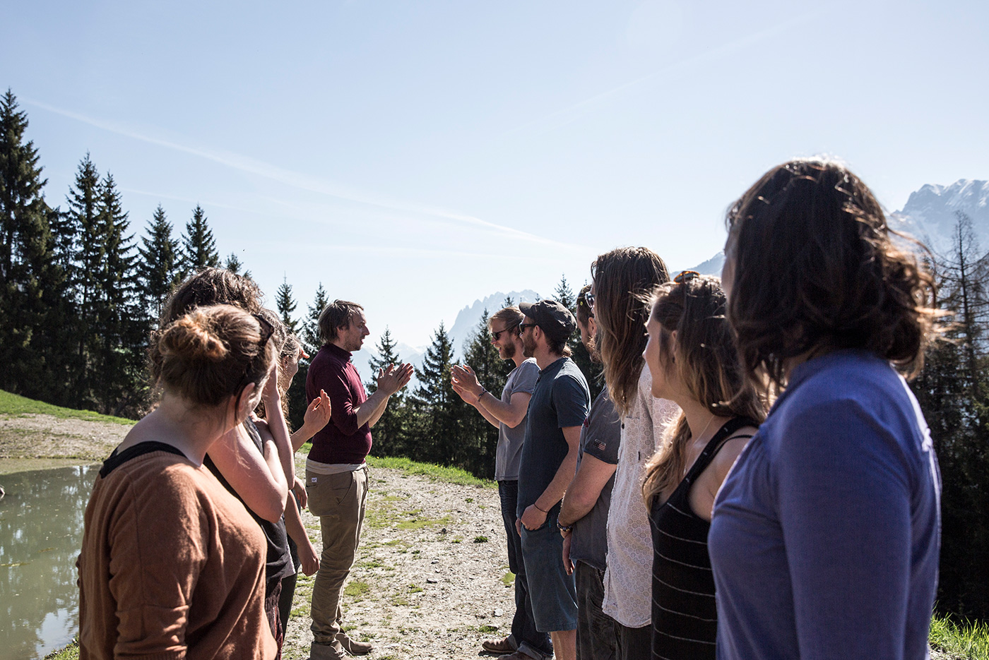 Wir wechseln zwischen Stube und Kapelle hin und her, jodeln im Stadel oder am Teich und merken deutlich, wie sich die veränderte Akustik auf den Klang der Stimme auswirkt. Dabei singen wir meist zwei- oder dreistimmig, mal kommt die Geige zum Einsatz, dann die Gitarre. Dann gibt es wieder herausfordernde Übungen oder unterhaltsame Aufgaben. Vieles geschieht impulsiv und intuitiv: Ein Nieser, ein herumliegendes Kochbuch, ein Klassiker – kaum zu glauben, was man bei der richtigen Stimmung alles „verjodeln“ kann.