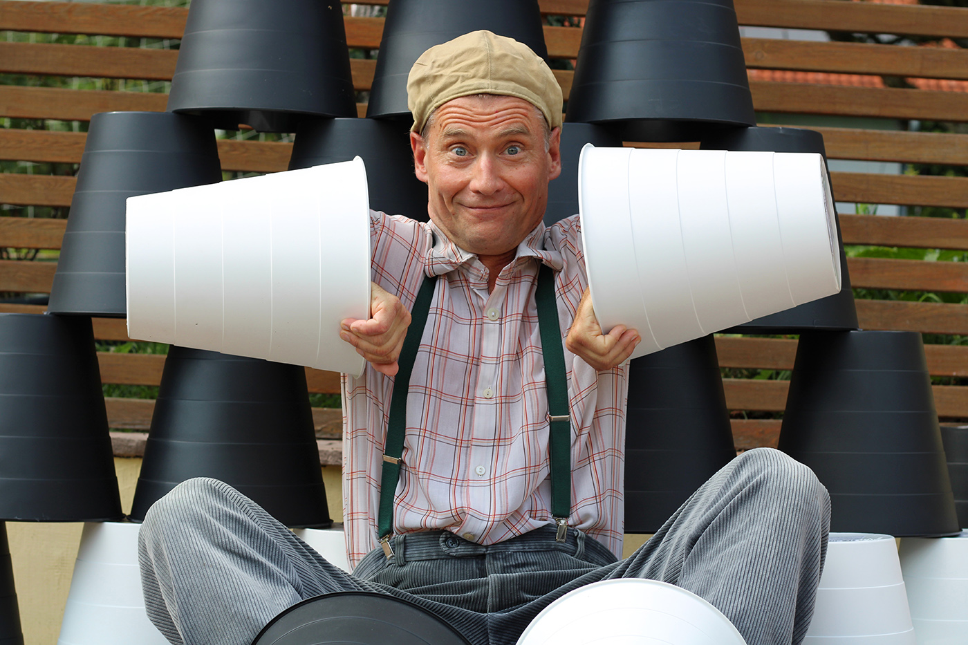Benny bringt unzählige Kübel mit, schwarze und weiße. Er baut sie um und baut sie auf, entdeckt darunter Bälle und lässt sie fliegen. Mit der Hilfe von freiwilligen Kindern (und Erwachsenen) werden Türme gebaut, Mauern erklommen und fantasievolle Figuren entworfen. Benny lässt seinen Besen tanzen und die Kinder balancieren. Benny Barfuß ist ein Virtuose des Unsinns, der nicht nur Kinder mit seinen skurrilen Späßen bezaubert – als liebenswert-naiver Komödiant lässt er Alltagsgegenstände fliegen und erzählt alltägliche Geschichten. Er begeistert durch gekonnte Tollpatschigkeit ebenso wie durch Akrobatik. Geeignet für Besucher ab 3 Jahren. Dauer: ca. 50 Minuten.