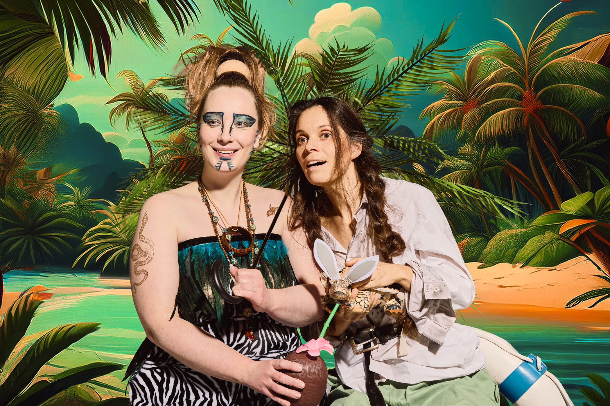 Fast jeder kennt die Geschichte des Robinson Crusoe. Doch im Unterschied zum Originalroman kommt die Fassung der „Theaterachse“ ganz ohne Menschenfresser aus. Dennoch gibt es viele Parallelen. Robi und Freitag sind zwei Frauen unterschiedlicher Herkunft. Eine kommt aus einer europäischen Hafenstadt, die andere von einer kleinen Südseeinsel. Beide erzählen im Rückblick von ihrem großen Abenteuer – als sie von einem Sturm auf eine unbewohnte Insel geworfen wurden. Sie versetzen sich in die Zeit zurück, als sie im Alter von acht Jahren plötzlich alleine waren und auf unterschiedliche Weise mit der Situation zurechtkommen mussten.